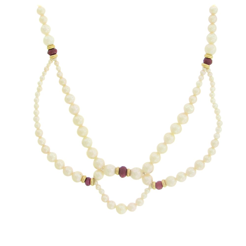 For any princess or warrior princess, a pearl swag necklace to wear composed of 14K gold beads, faceted ruby beads and cultured pearls from 2.5mm to 7mm. The necklace is 16″, safety clasp.
