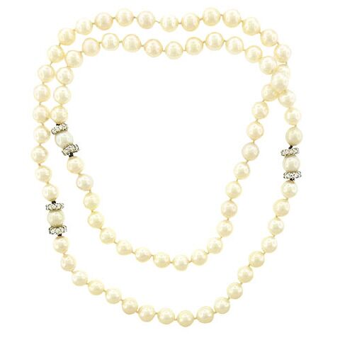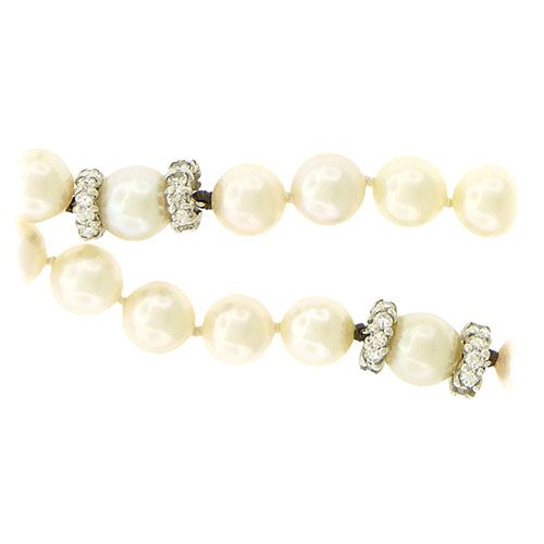Versatile 32″ pearl strand detaches at the diamond clasps to wear full length, doubled, shorter length, or with bracelet and necklace together. The 8mm pearls have three diamond clasps, set with approx. 2.50 carats diamonds in white gold. A classic and very wearable gem from a private estate.