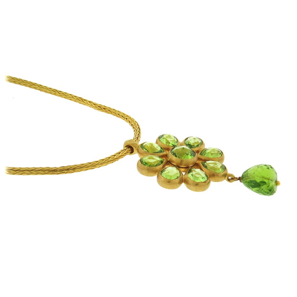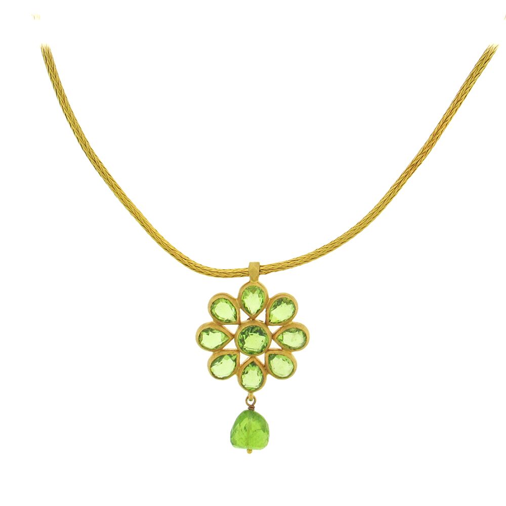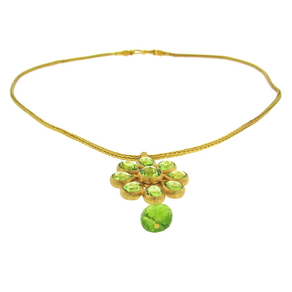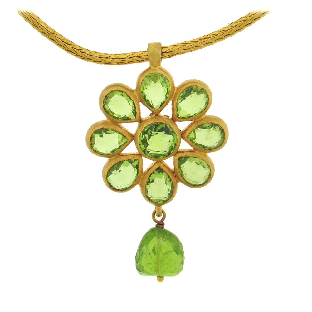 Sparkling green peridot flower necklace comprised of round, pear-shape and briolette gems, is set in 22K gold, on a woven 16″ chain with shepherd’s hook clasps. The pendant is 7/8″ x 1-1/2″ long.