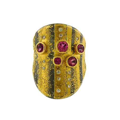Atelier Zobel has long been known for these ‘cigar band’ style rings, bold and comfortable. Peter Schmid of Atelier Zobel sets this one apart with his selection of sparkling round intensely pink tourmalines, 1.15 cts tw, set in a 24K gold over oxidized sterling silver in this elongated style, accented with 0.13 carats champagne diamond melée. Ring measures 5/8″ x 1-1/16″ long.