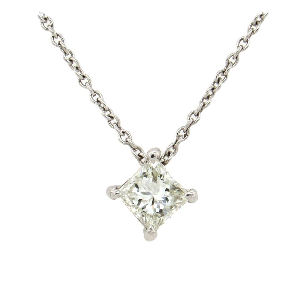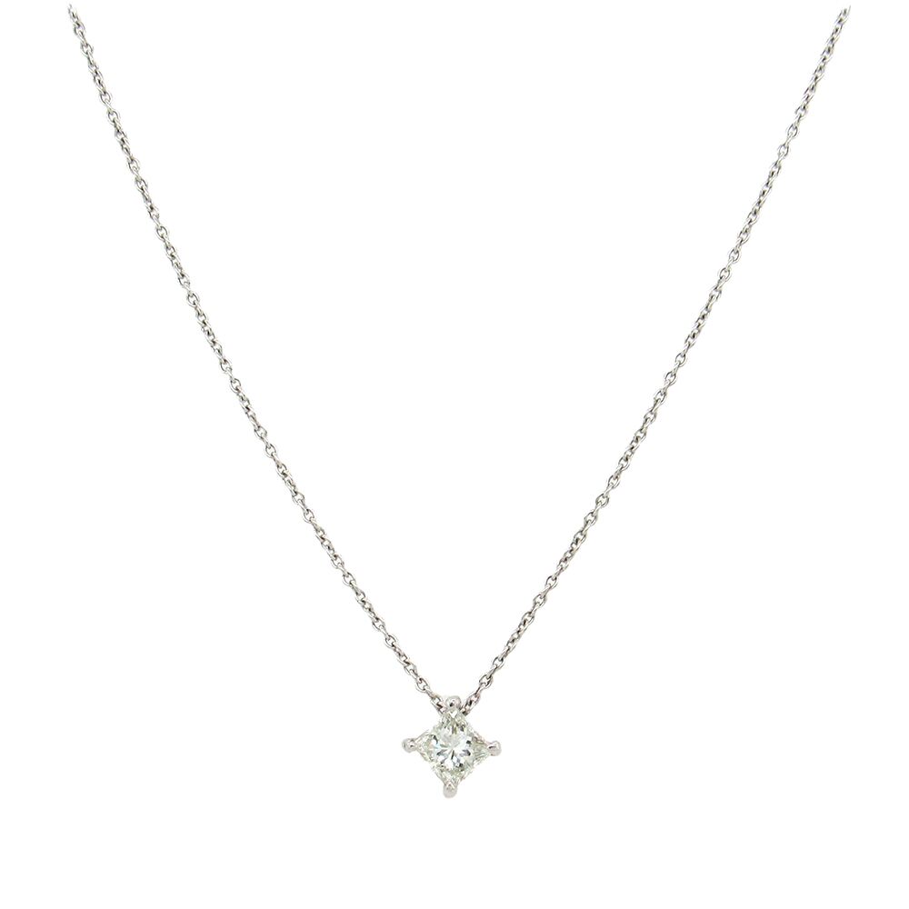 Diamond pendant sets a sparkling 0.55 carat princess-cut diamond with a 14K white gold setting and fine 16″ cable chain.