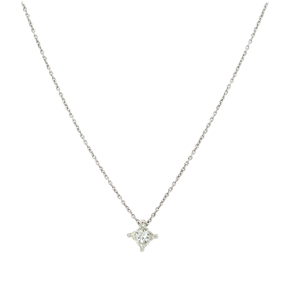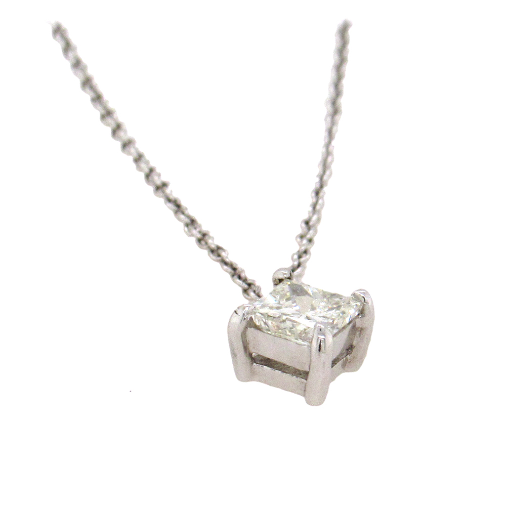 Diamond pendant sets a sparkling 0.55 carat princess-cut diamond with a 14K white gold setting and fine 16″ cable chain.