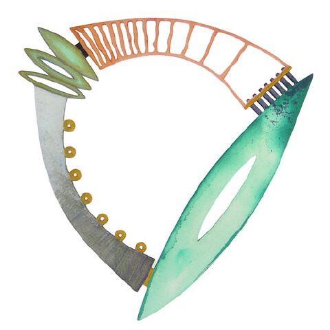 Rebekah Laskin’s hand-painted 3D printed bracelets can be worn together or alone, this one emphasizing the triangular form , the color switching from a turquoise and rose palette on one side to gold, pink and muted grays on the other.