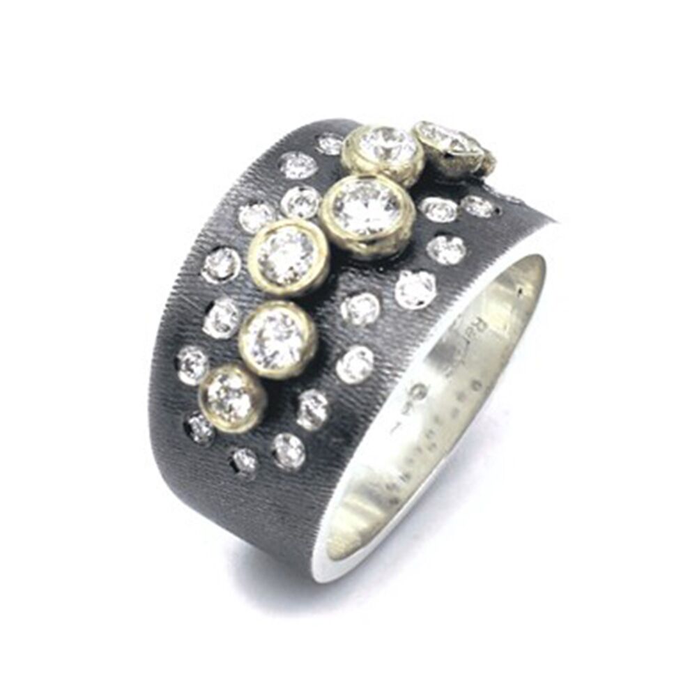 Rene Escobar sets precious diamonds in his oxidized sterling and 18K gold band, the ‘Victoria’, set with diamonds in gold bezels and directly in the sterling silver. The ring measures 3/4″ x 1/2″.