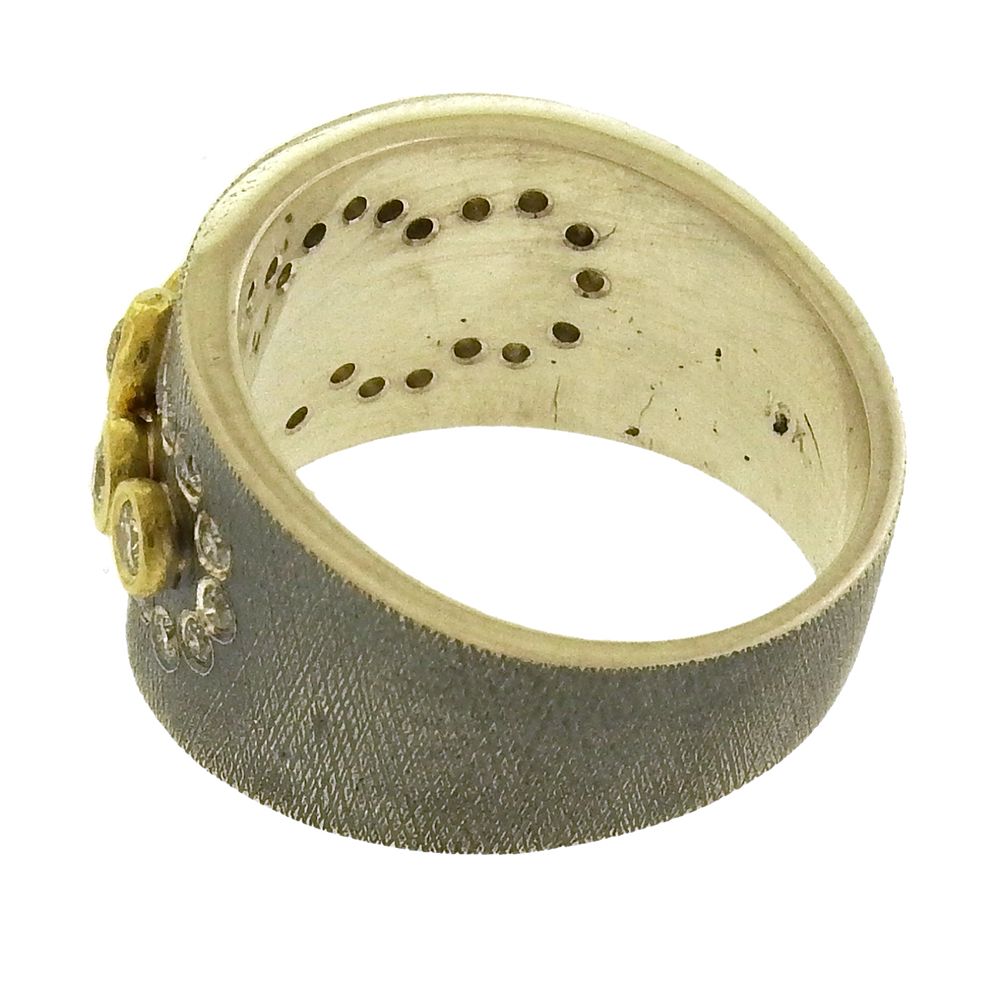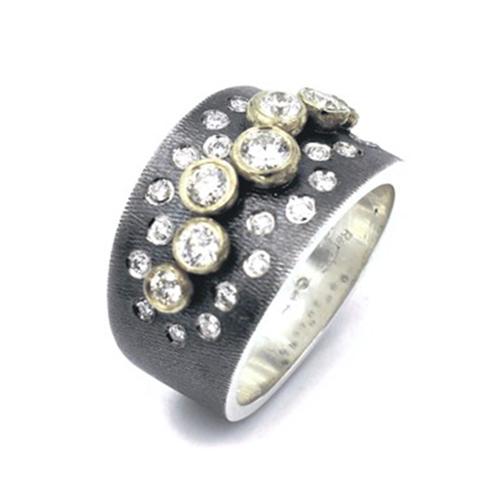 Rene Escobar sets precious diamonds in his oxidized sterling and 18K gold band, the ‘Victoria’, set with diamonds in gold bezels and directly in the sterling silver. The ring measures 3/4″ x 1/2″.