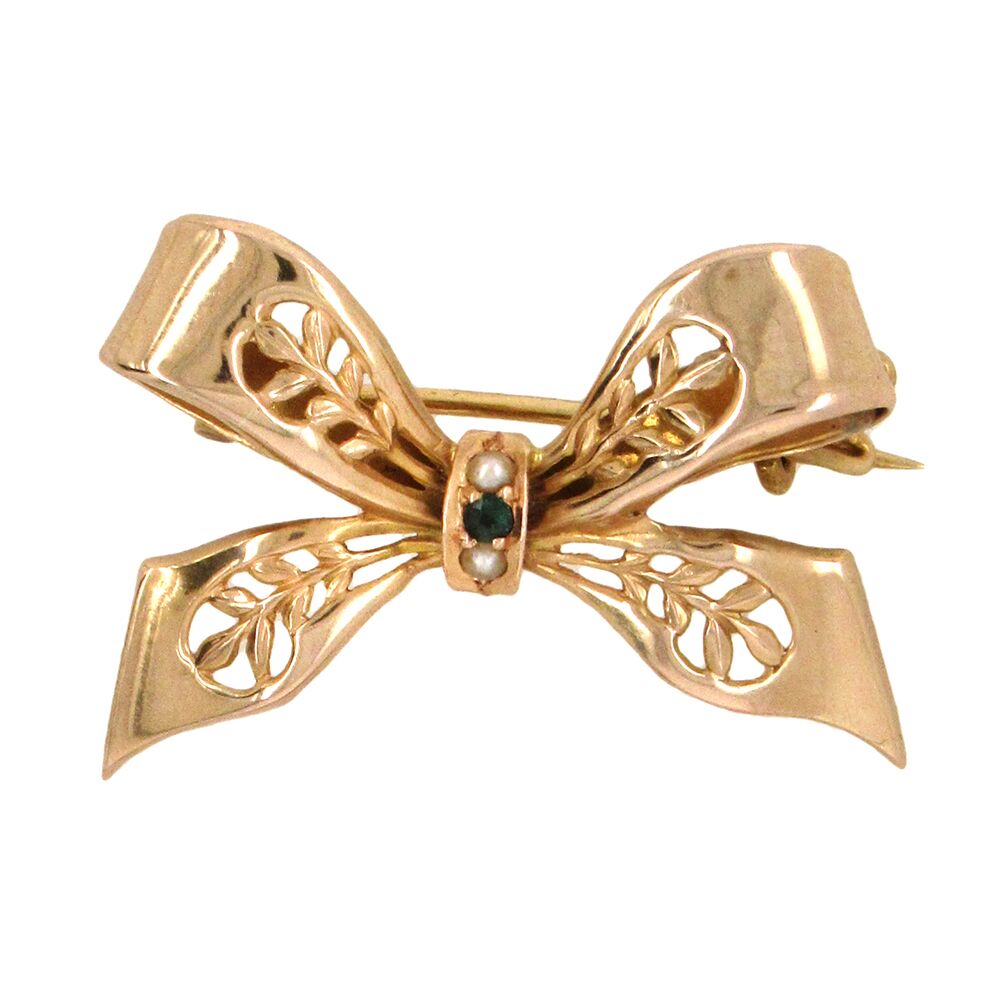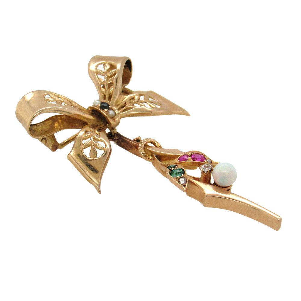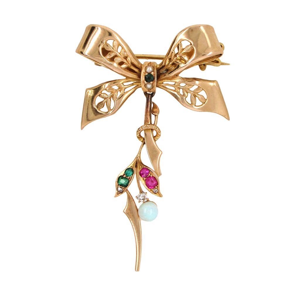 18K gold openwork ribbon bow pin measures 1-1/4″ x 7/8″, with detachable pendant in ribbon form set with a round opal bead, emeralds, rubies and a champagne diamond, measuring 1-3/4″. Circa 1900’s.