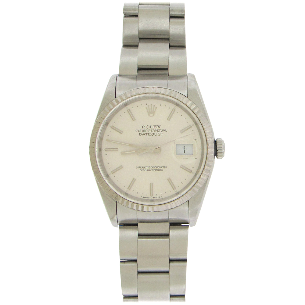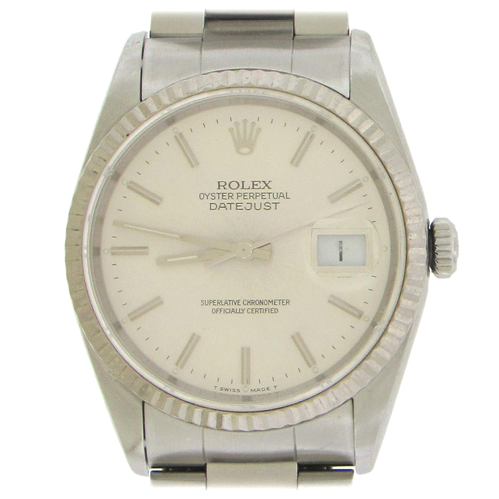 Stainless steel Rolex Ref. 16234 Datejust circa 1992, is a 36mm automatic center seconds water-resistant chronometer wristwatch with date and a stainless steel Rolex Oyster bracelet with deployant clasp. The case has a screwed-down case back and crown, engine-turned 18K white gold bezel, silver dial with applied white gold baton hour indexes, outer minute/seconds track, aperture for the date, and white gold baton hands. The caliber 3135 movement is rhodium-plated, 31 jewels, with hack mechanism, warrantied by Aaron Faber for 2 years, is provided with an extra crystal.