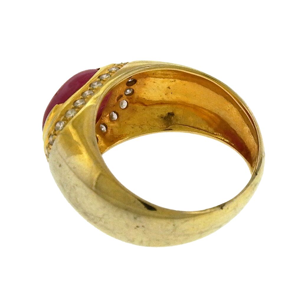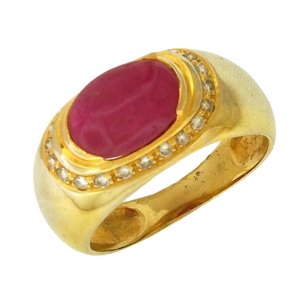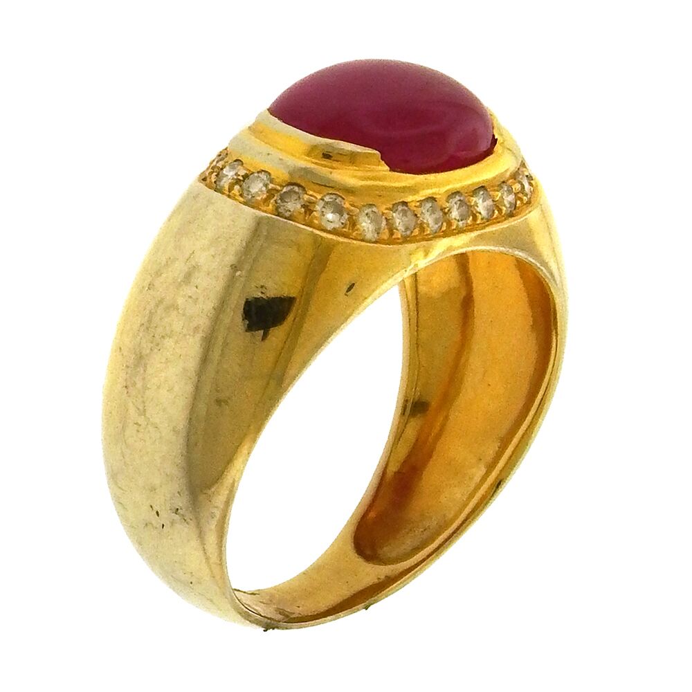 Oval ruby cabochon, approx. 2 carats, set in a classic diamond-framed domed mounting, size 7.