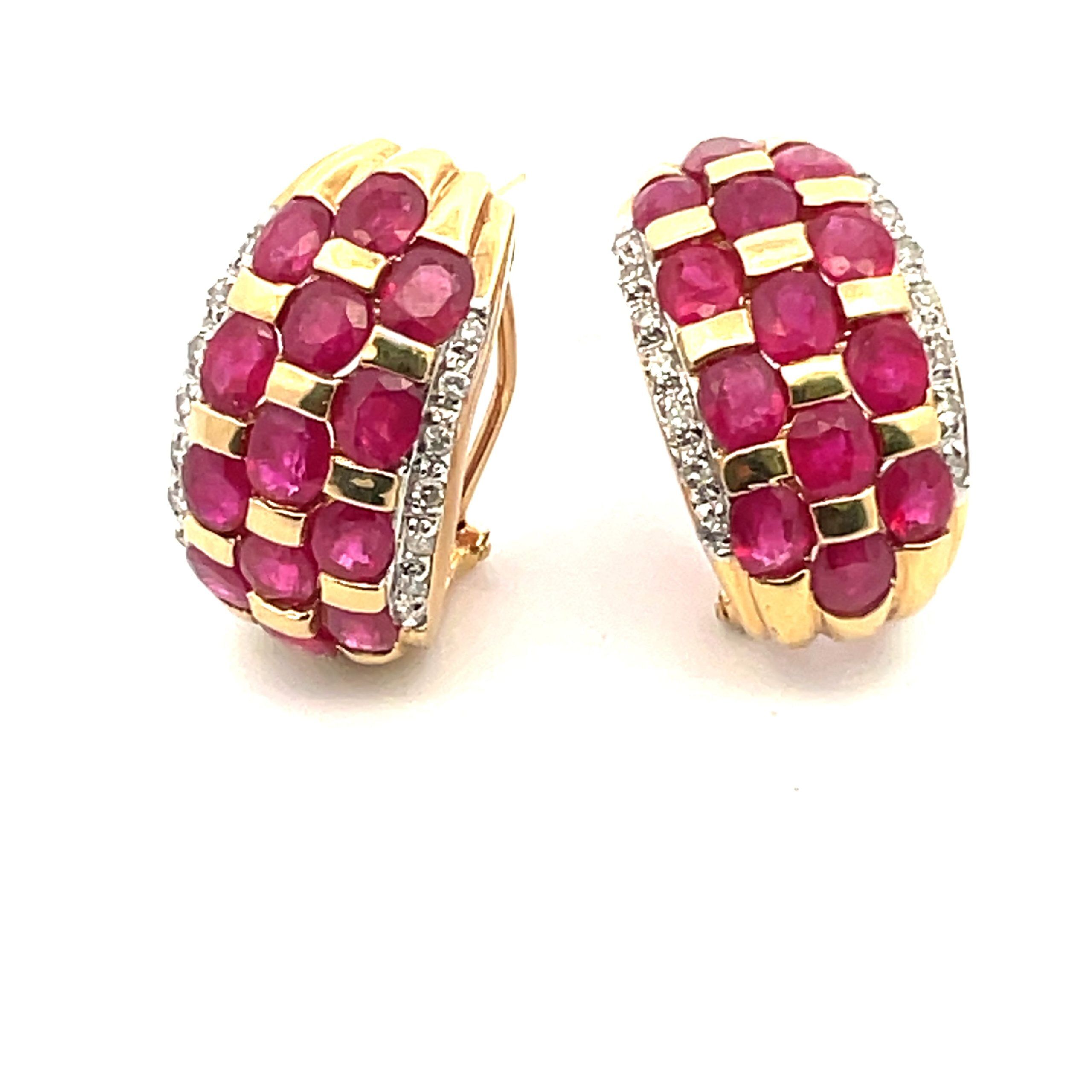 Vintage ruby and diamond bombé half-hoop earrings are set with approximately 10 carats oval faceted rubies and 0.50 carats tw diamonds, in a 14K yellow gold curved earring, circa 1950’s. Measures 1/2″ x 7/8″ long.