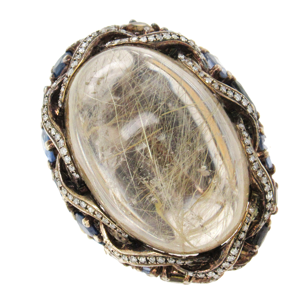 A wizard’s ring is set at center with large oval cabochon rutilated quartz in sterling silver, the mounting wrapped with curving diamond vines and set all round with gemstones: sapphire, citrine, andalusite and tourmaline. The ring measures 1-1/8″ x1-1/2″ x 1″ above the hand and is size 8.