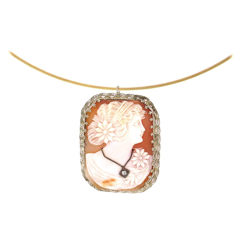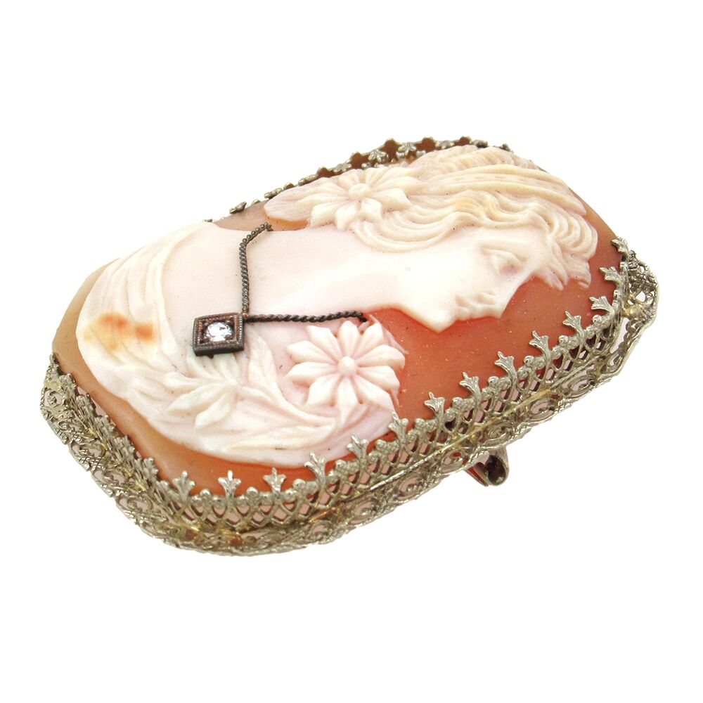 Rectangular cushion-form shell cameo carving includes three daisy-like flowers and a diamond-set necklace, set in a 14K white gold Regency style openwork frame with fleur-de-lis bezel. The cameo brooch and pendant measures 1-3/8″ x 1-3/4″.