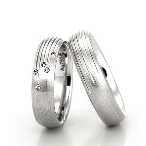 One of Christian Bauer’s newest and most popular bands for women , shown left, sets five diamonds in a shooting star pattern of incised lines, 5mm wide band. Christian Bauer is one of the premier designers of contemporary wedding bands for men and women.