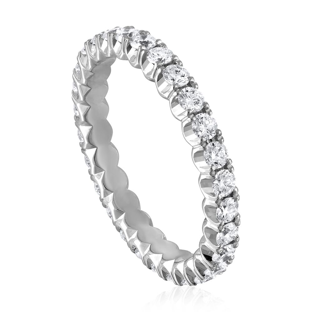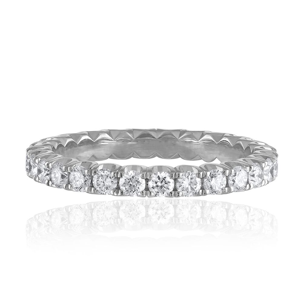 Sparkling diamond eternity ring from SimonG sets 1.07 cts diamonds in a full round 18k white gold ring, 3.5mm. Can be ordered in any size, platinum or gold.