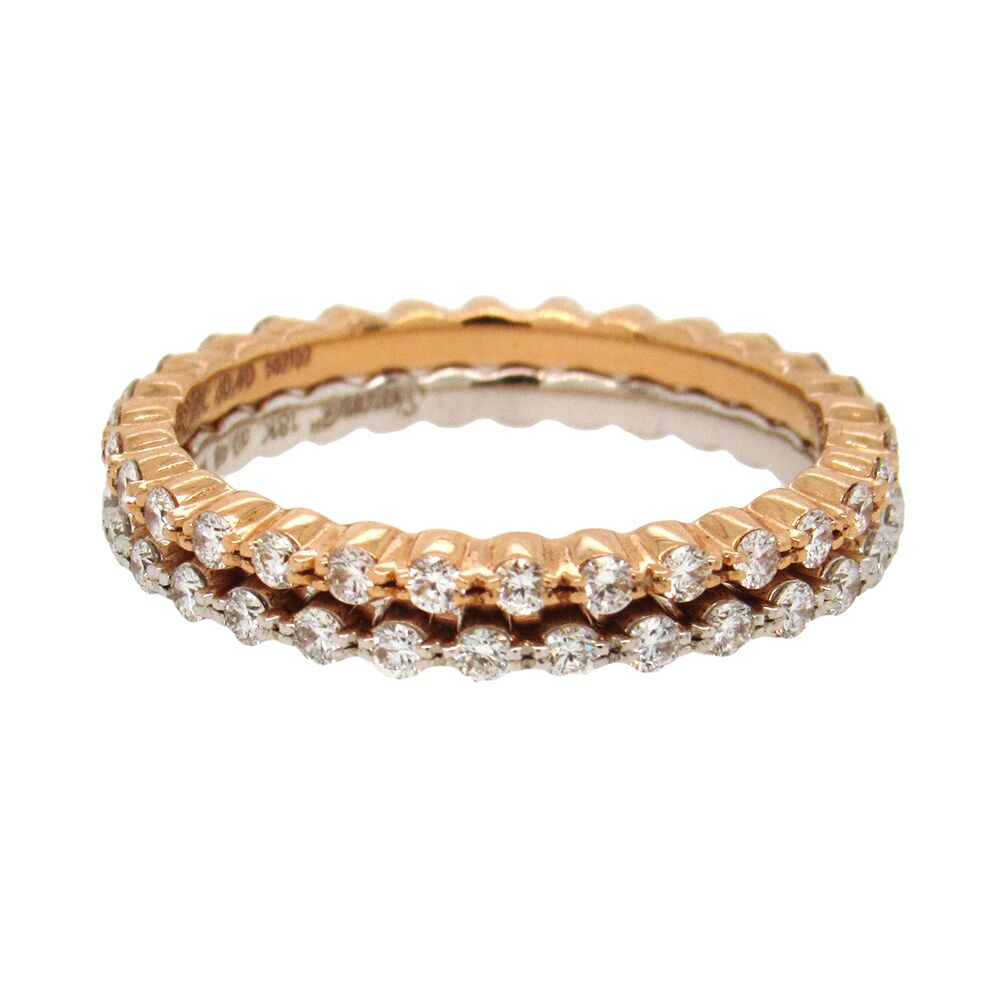 Simon G’s beaded diamond eternity band is everyone’s favorite stacker and go-with: our clients use this band in groups of three: rose, yellow and white gold. We’ve even discovered that this is the ring that works perfectly with that heirloom antique engagement ring. This version is 18K rose gold, 2mm, set with 0.40 carats diamonds, the genius of Simon G’s design: the mounting is designed to show only the gems, with tiny beading in between, and they nest if you stack them.