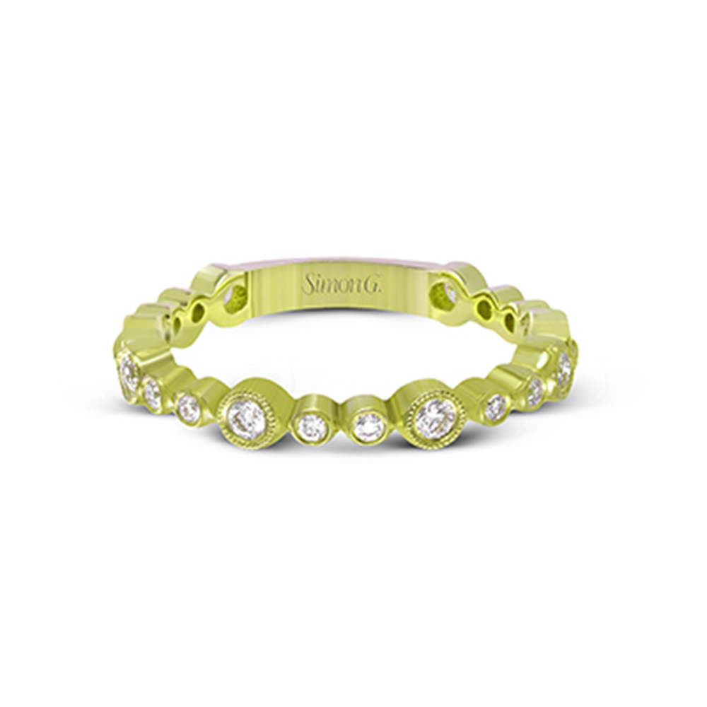 We love this 18K yellow gold 3/4 eternity band from SimonG, alternating two sizes of bezel set diamonds, 0.31 carats tw, in a charming eternity band. 3mm wide.