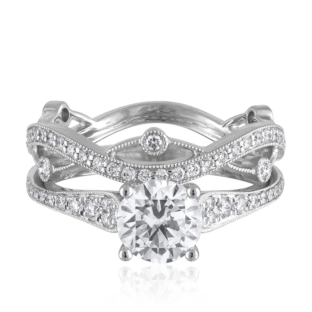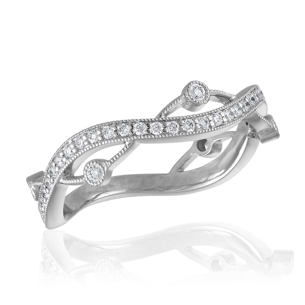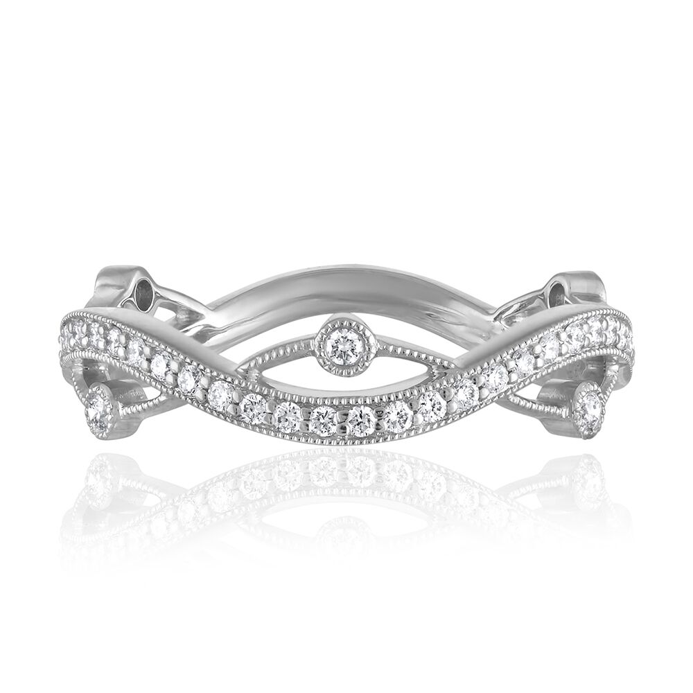 We love this airy diamond wave band from SimonG with its curvaceous styling, 0.29 cts diamonds tw, and it nests well with many engagement rings. Measures 5mm at the widest. Shown with engagement ring mounting ENG01289, sold separately.