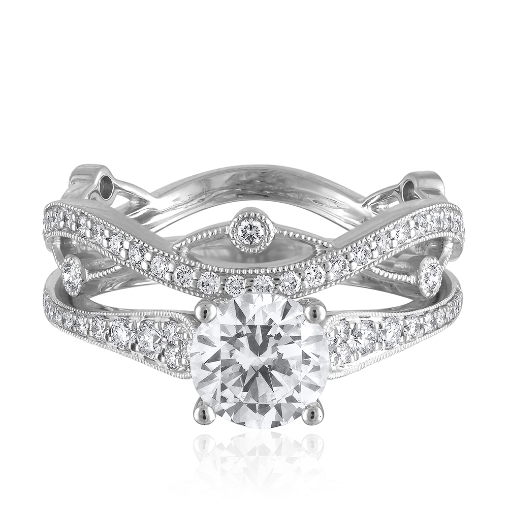 SimonG’s graduated diamond pave engagement ring mounting with detailed milgrained edges, set with 22 diamonds 0.18 cts tw, for a 1.00 to 1.25 carat diamond. Shown nested with WB01425, sold separately.