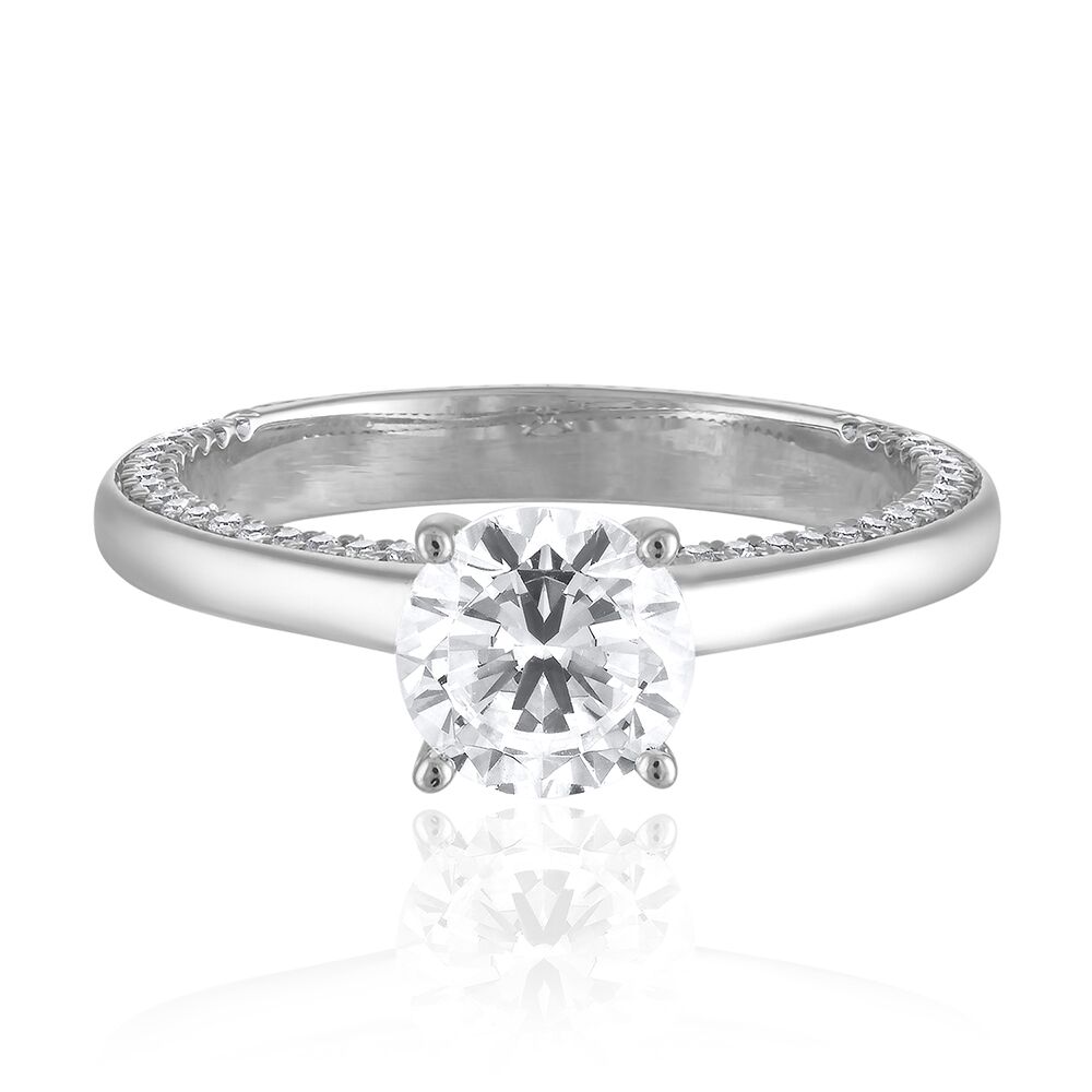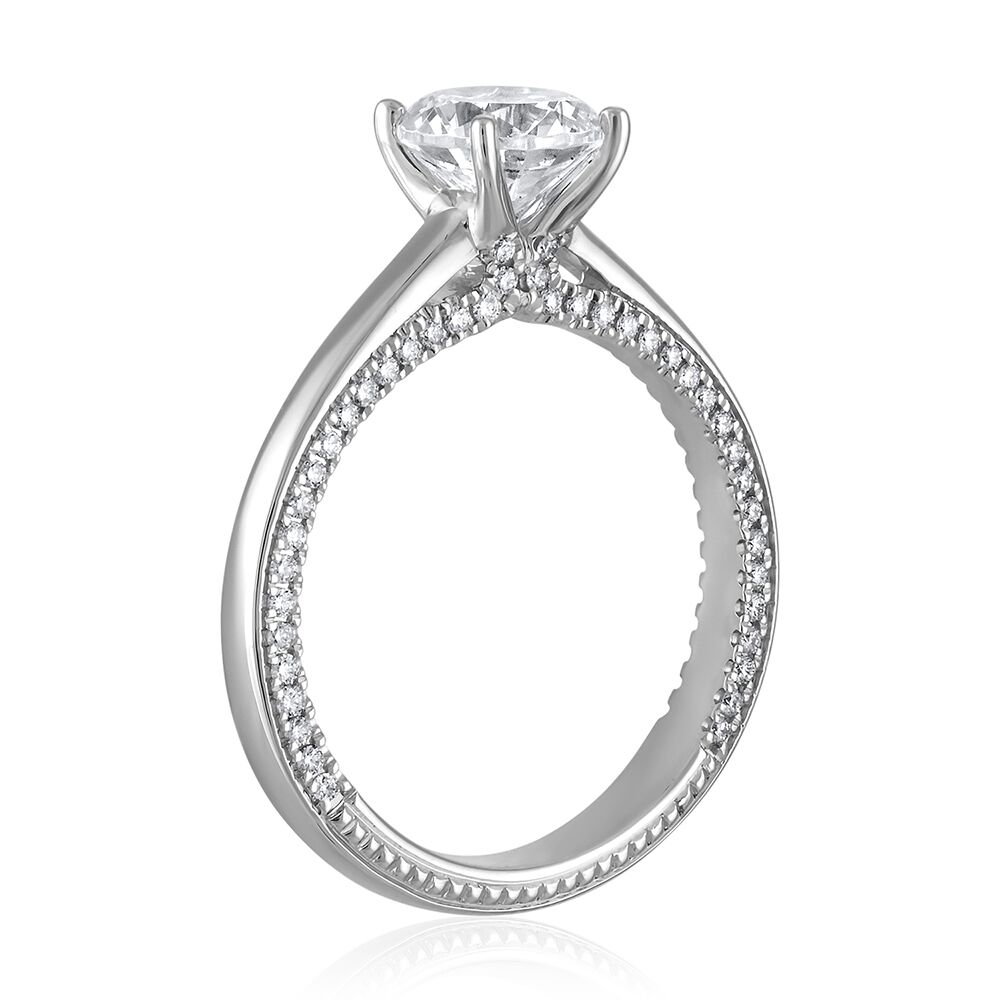 SimonG’s sculpted engagement ring mounting adds detail to the sides, both sides micropaved with 84 diamonds, 0.28 cts tw, to catch the sidelight, for a 1.00 to 1.25 carat center diamond. Awesome Piece to have it.