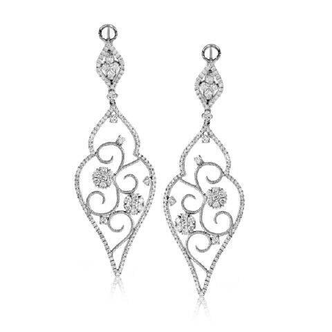 Dramatic diamond filigree earrings from SimonG are set with 1.98 carats micropavé diamonds — 266 round briliants in all! — in an 18K white gold drop with detailed engraveing and filigree curves. Earrings measure 3/4″ x 2-1/4″ long, 18K white gold posts and omega back.