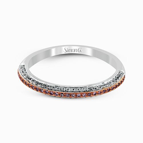 Go pink with SimonG’s diamond half-eternity band micropavéd on the sides with colorless diamonds, 0.34 carats, and on the top with pink diamonds, 0.07 carats for a color statement. Perfect as a stack ring or with your rose gold or white engagement ring.