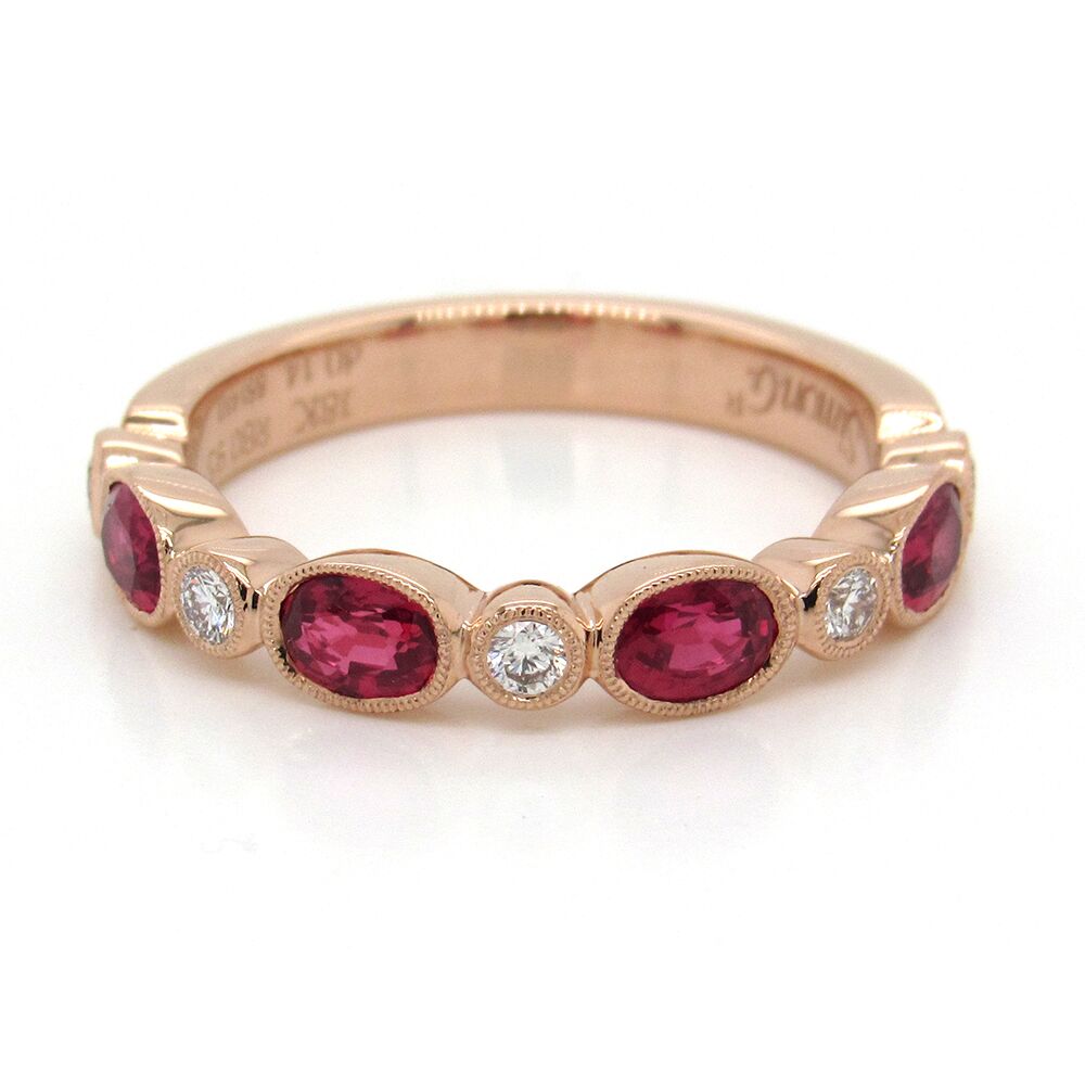 SimonG’s 9 stone diamond and ruby ring with detailed milgrain bezels, in 18K pink gold is set with four oval rubies, 0.95 cts, and 5 diamonds 0.14 carats, designed to wear solo or stacked. 4mm wide.