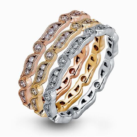 We love SimonG’s newest stacking rings, peapod-shaped curves set with micropavé diamonds, here in 18K yellow gold set with 0.27 carats. Each ring is 2mm. Each ring sold separately.