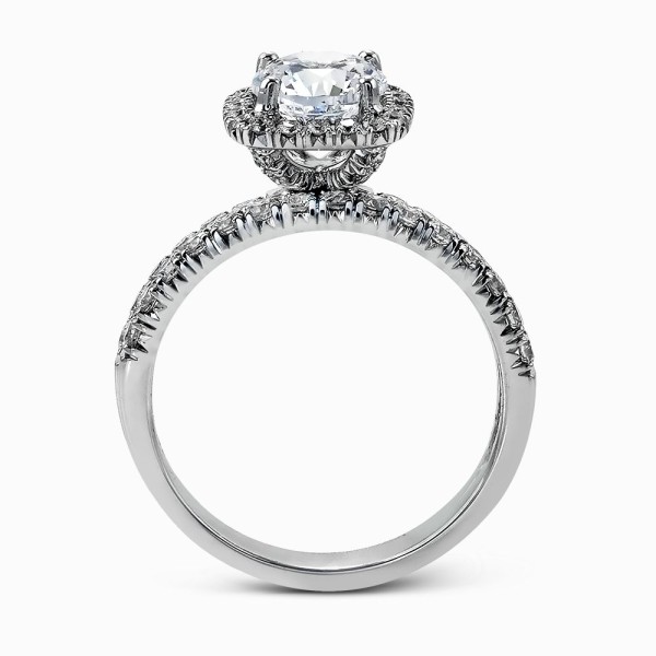 Diamond engagement ring set from SimonG sets 0.73 carat diamond micropavé on the band and semi-mounting of this wedding set, the cushion-form diamond halo designed for a 1 to 1.25 carat diamond. Remember, SimonG makes their bridal jewelry in platinum and yellow gold as well.