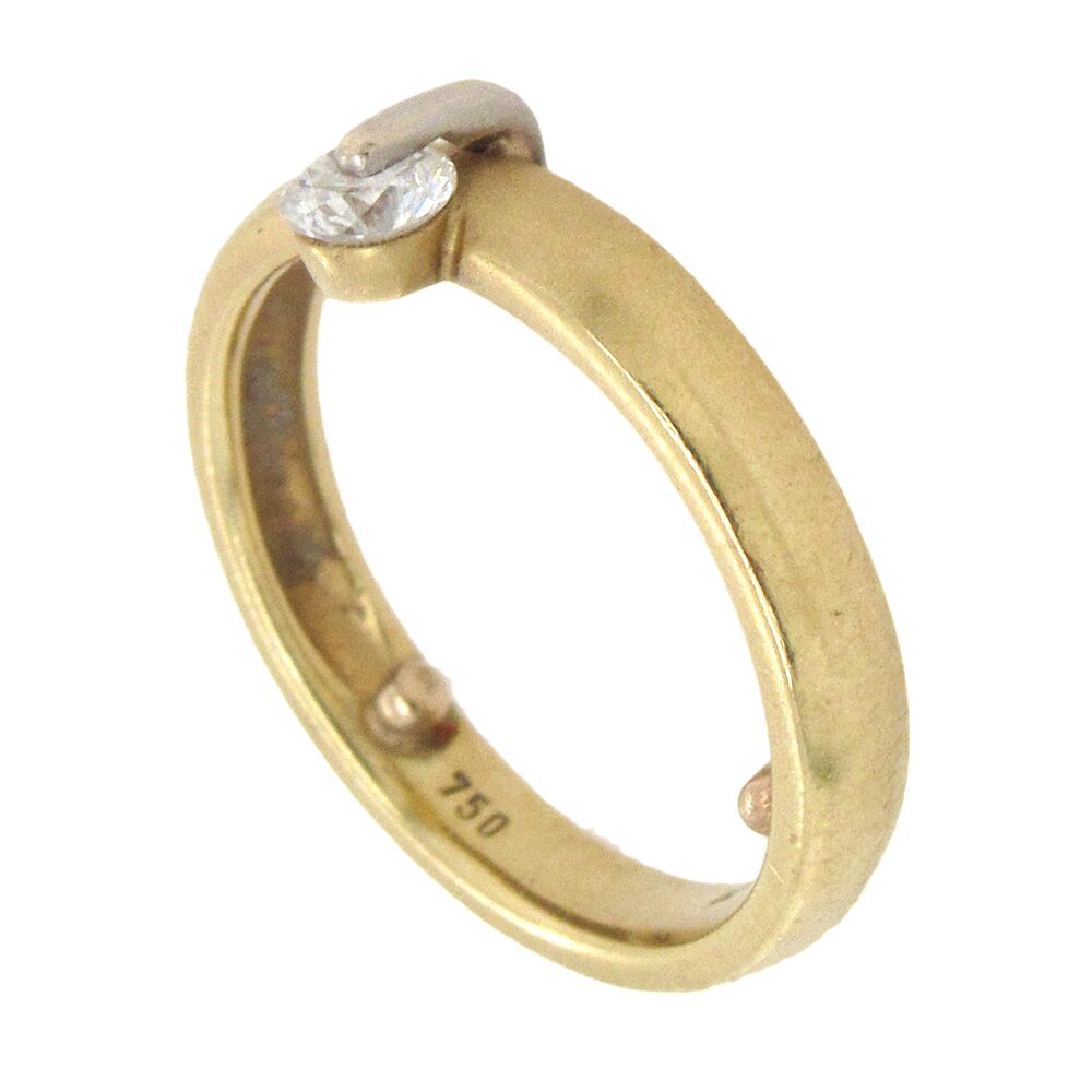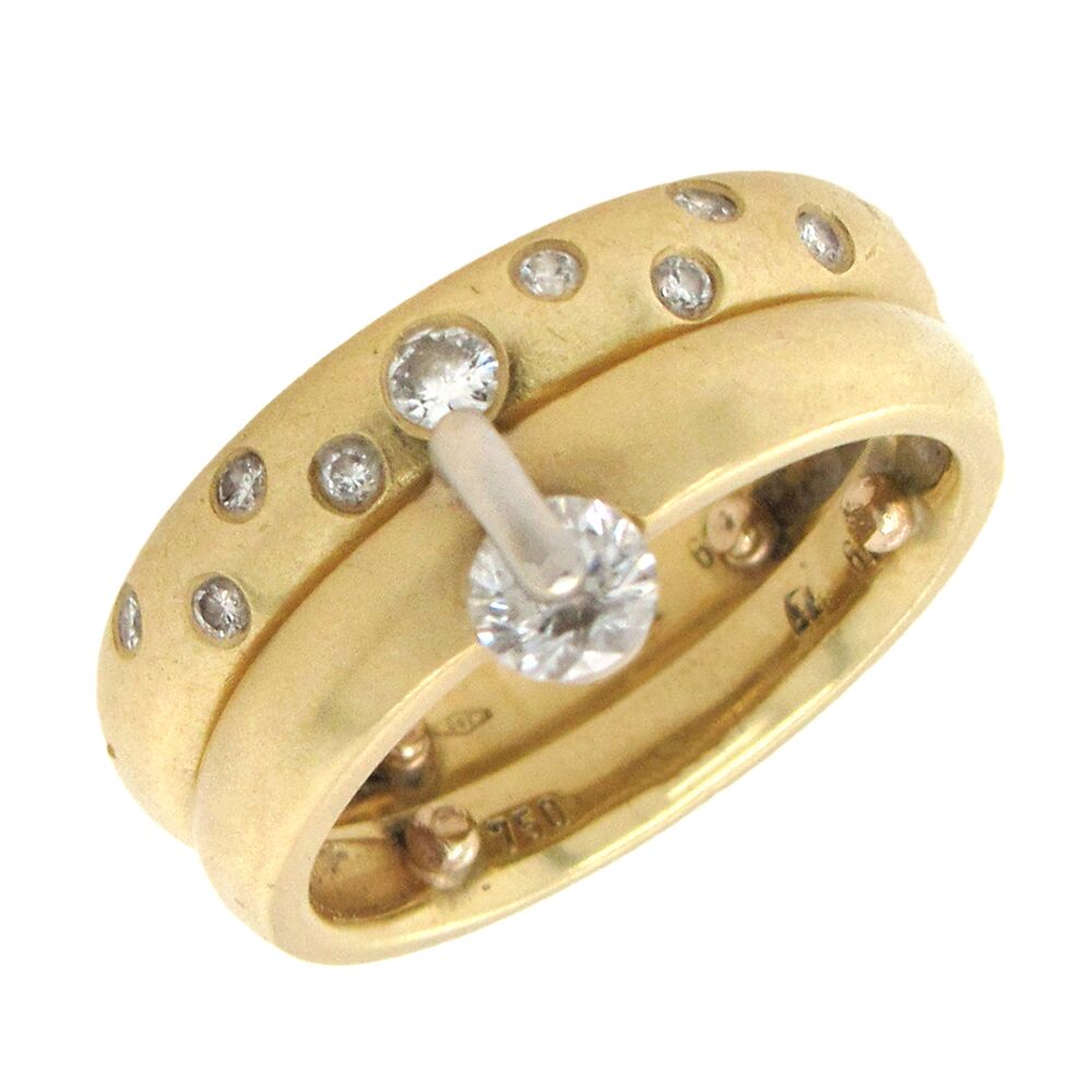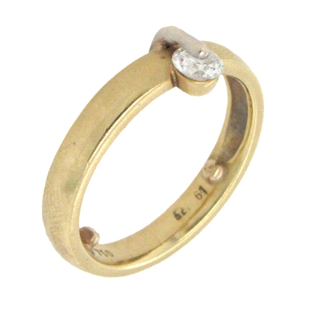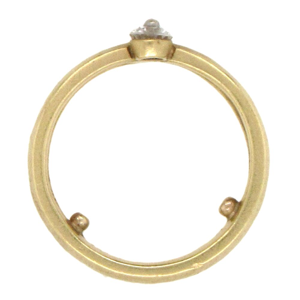18K gold European-made wedding band, size 7 and 5mm wide, set with a single diamond, approx. 0.15 cts, held by the slim horizontal gold bar on top. Pairs with RNG05151 to wear as a set, sold separately, or also with RNG05050 as a stack. Sizing beads can be removed to fit larger size.