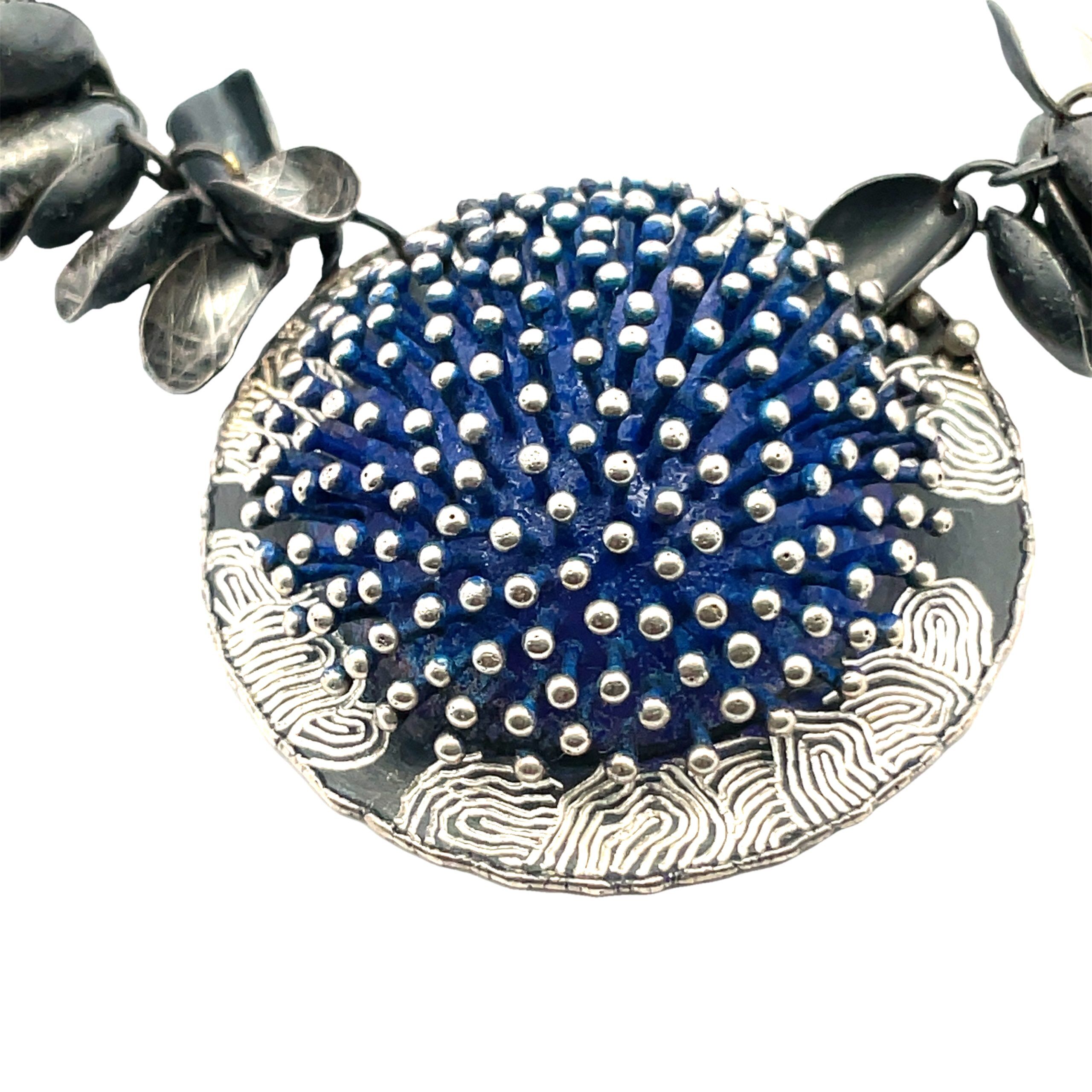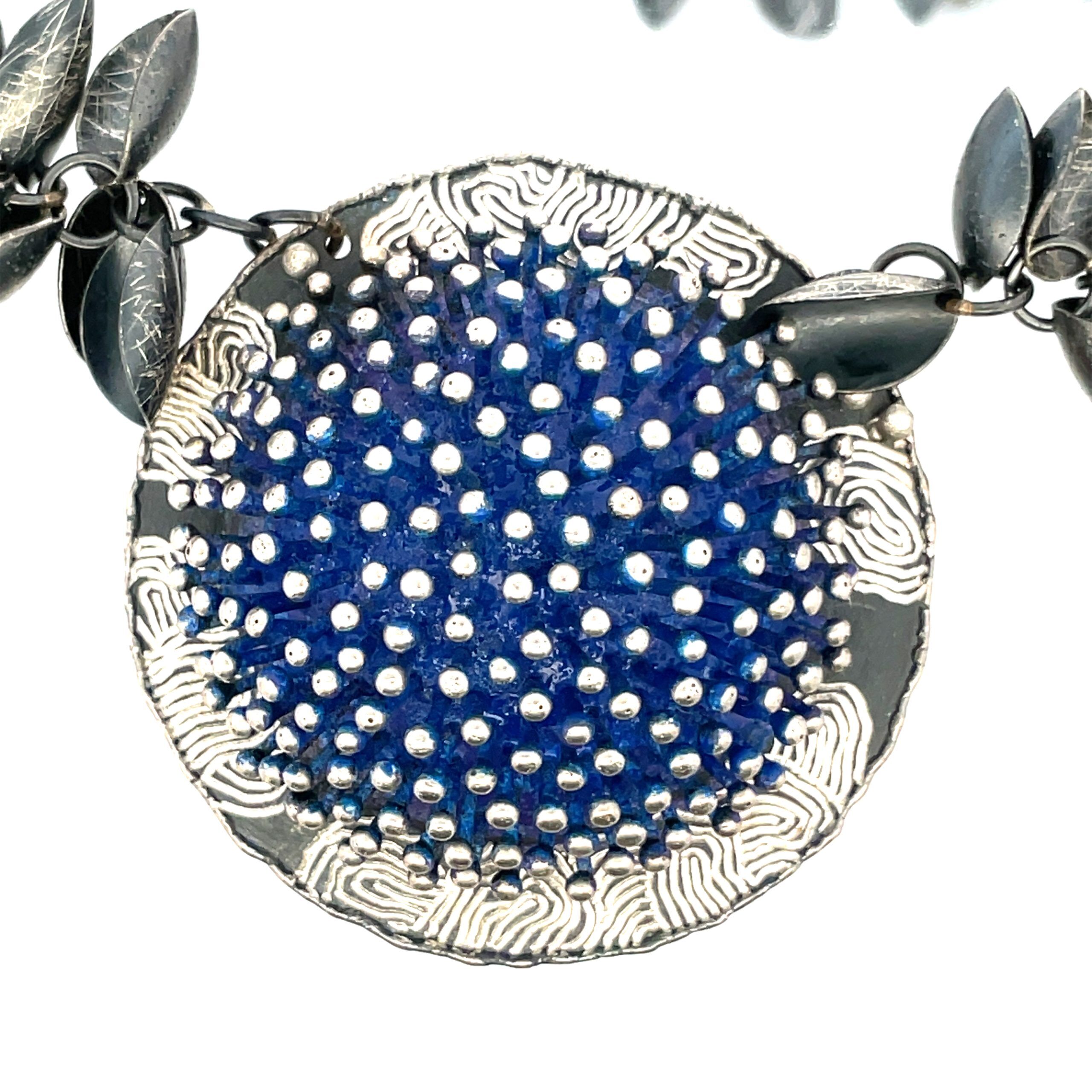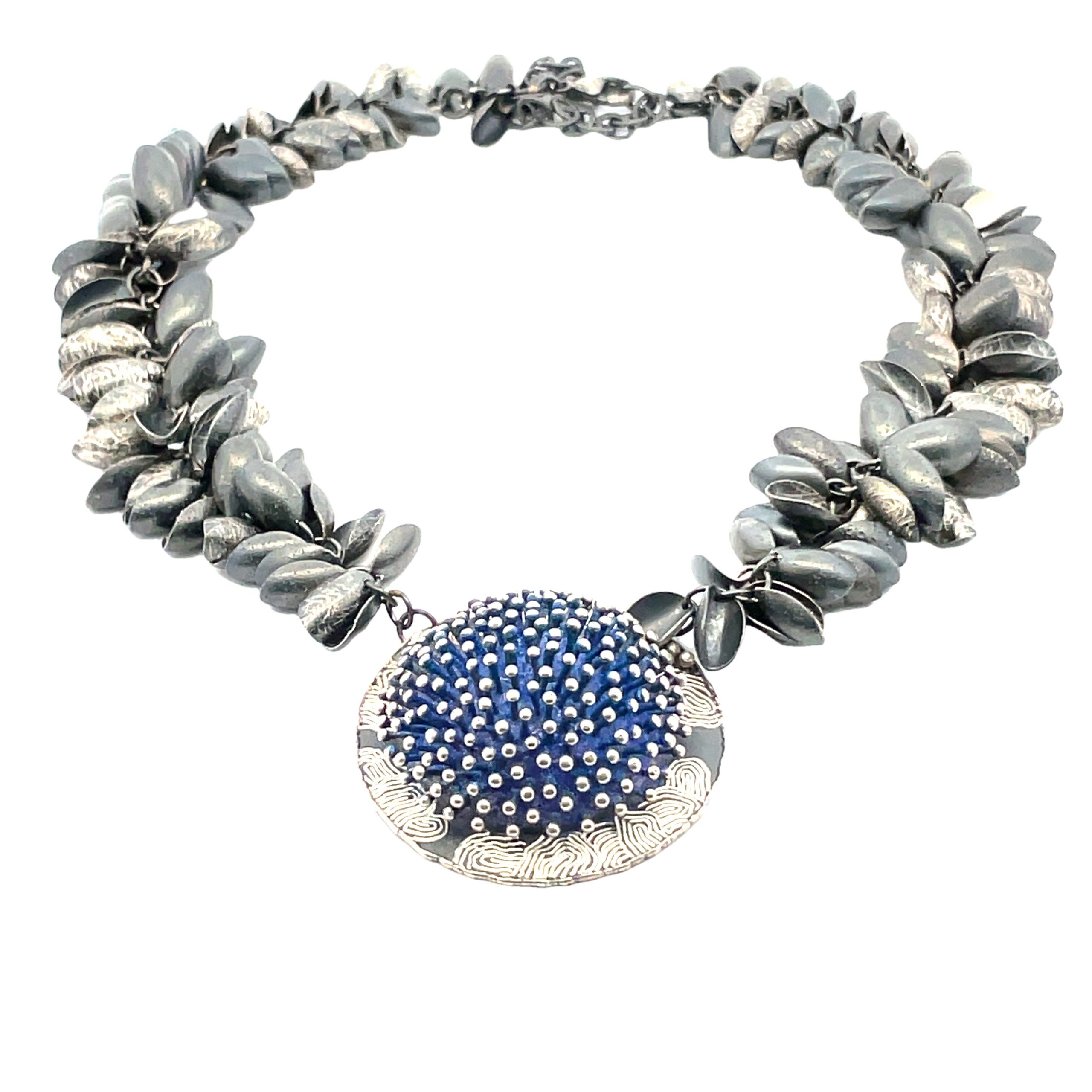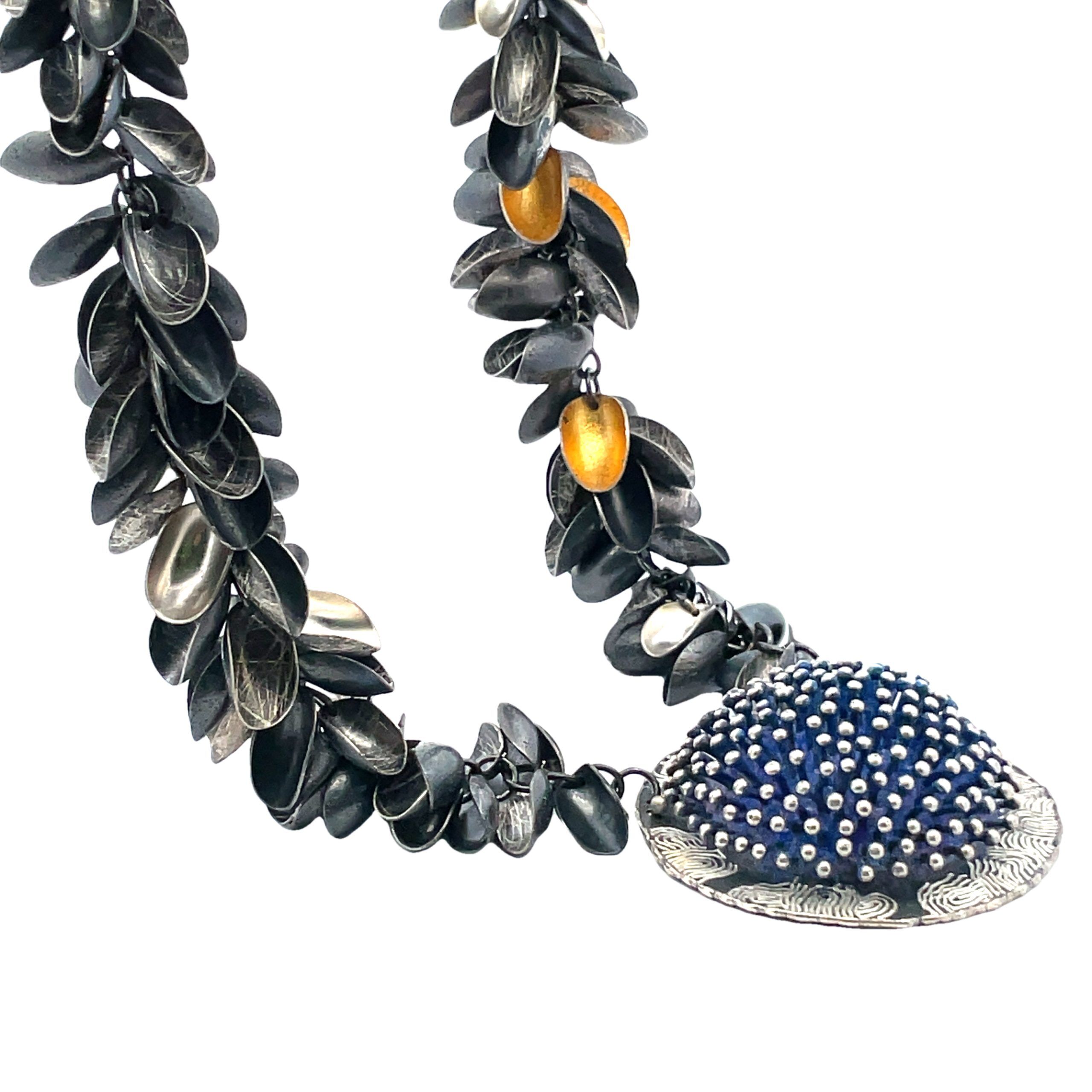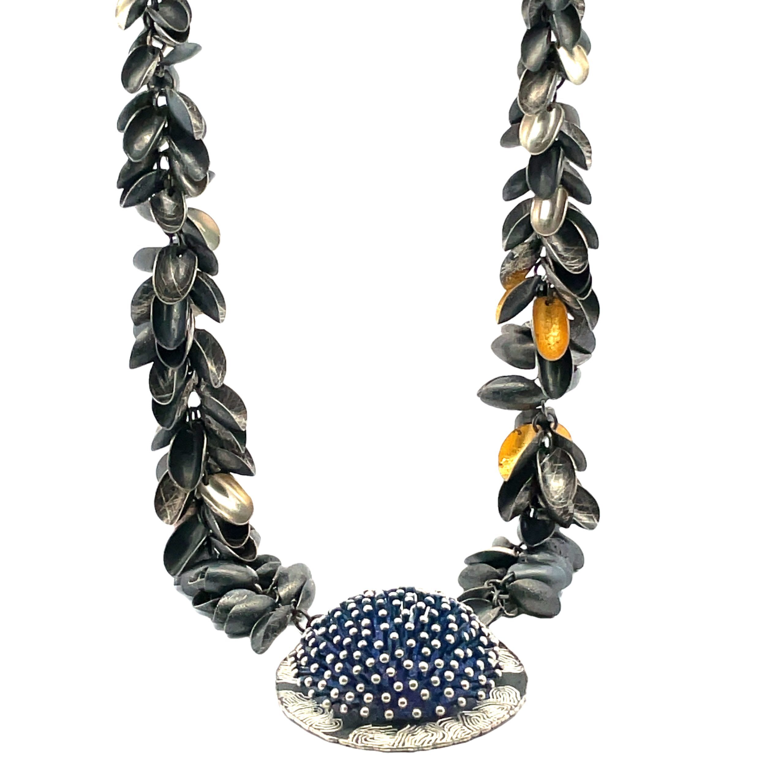 So Young Park’s signature pods –oxidized sterling silver and gold leaf– encompass the neck, with the center domed sterling pendant dotted with silver beads in blue powder coated enamel and engraved at the edges. The pendant measures1-1/2″ diameter x 1-1/4″, and the necklace is adjustable from 16″-20″.