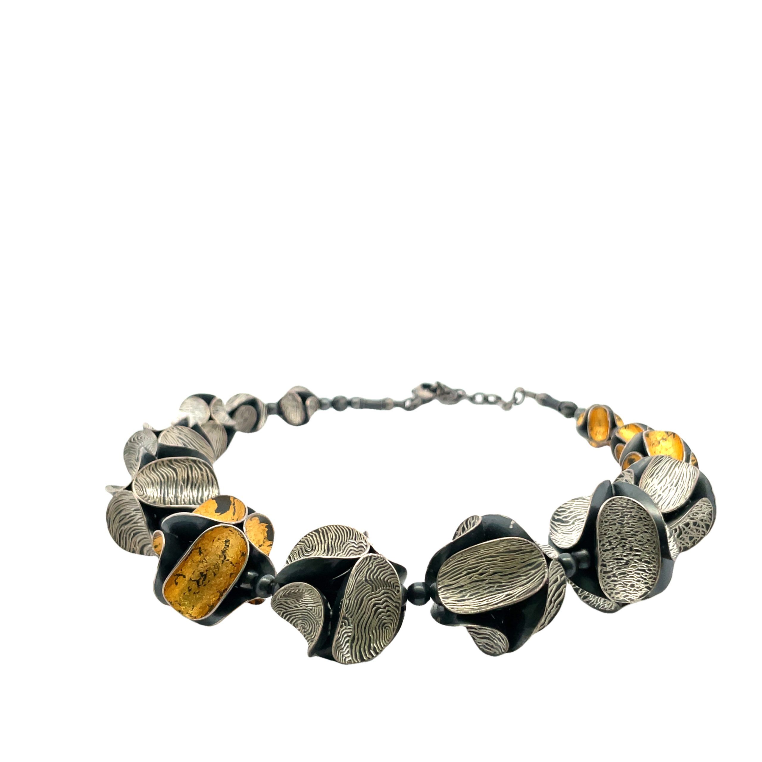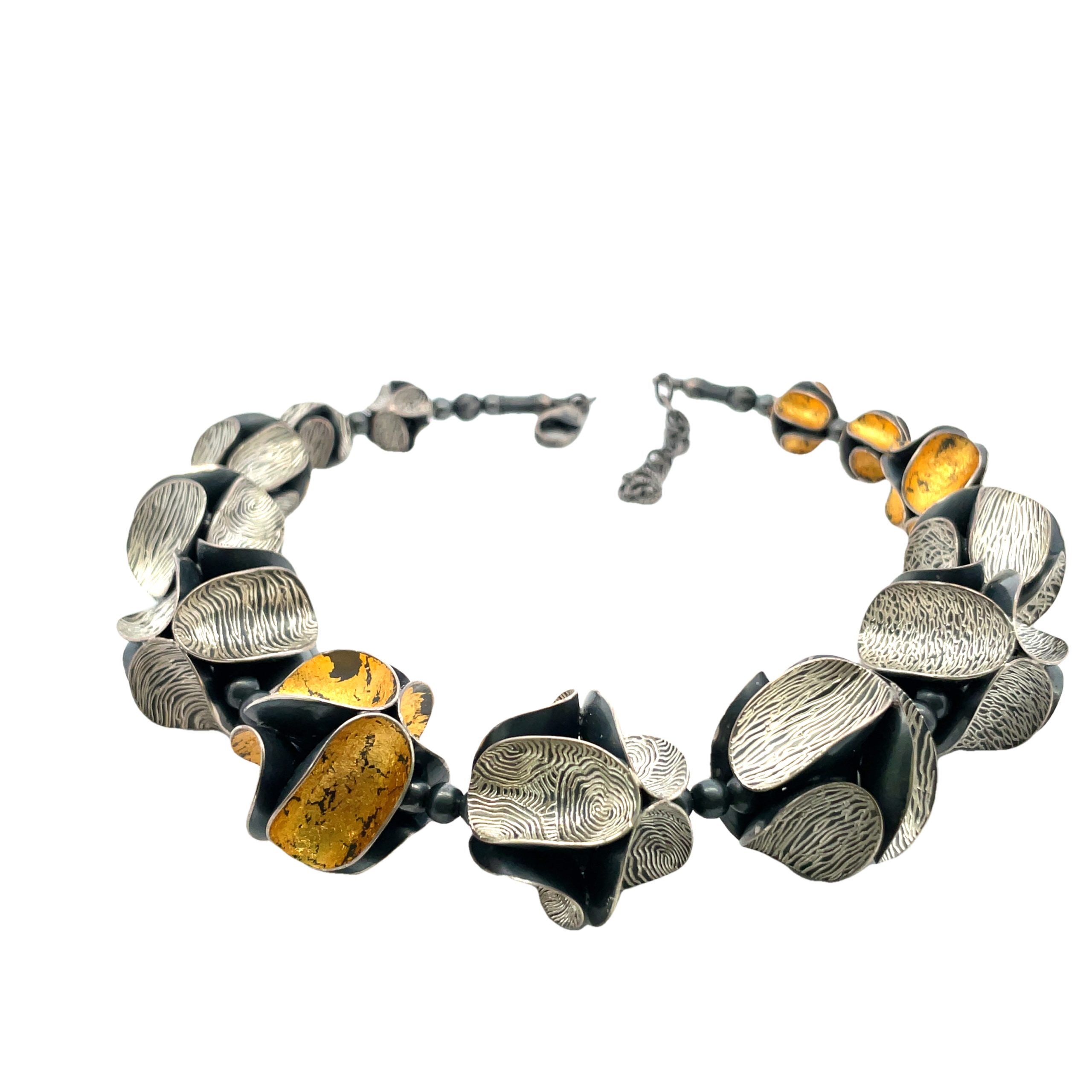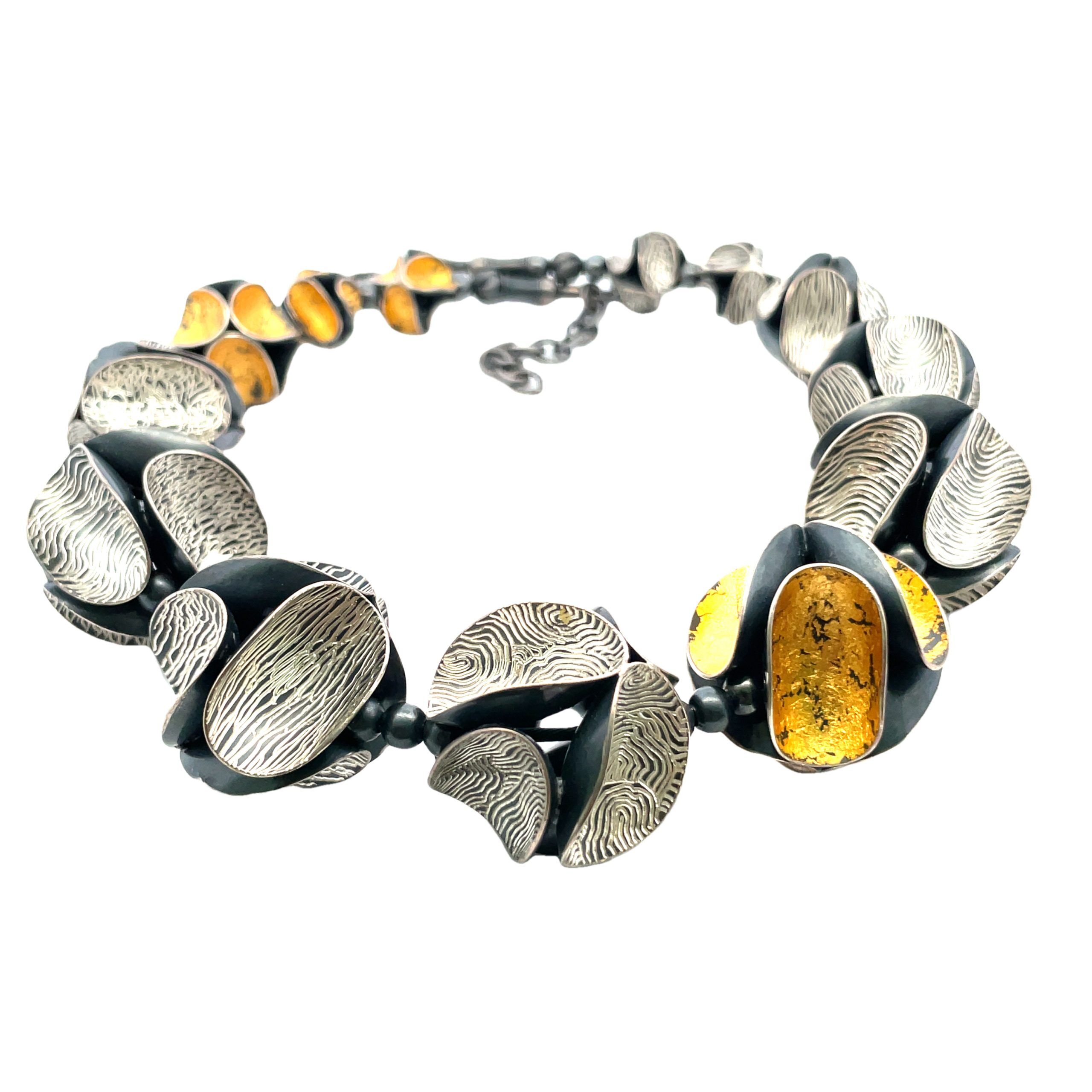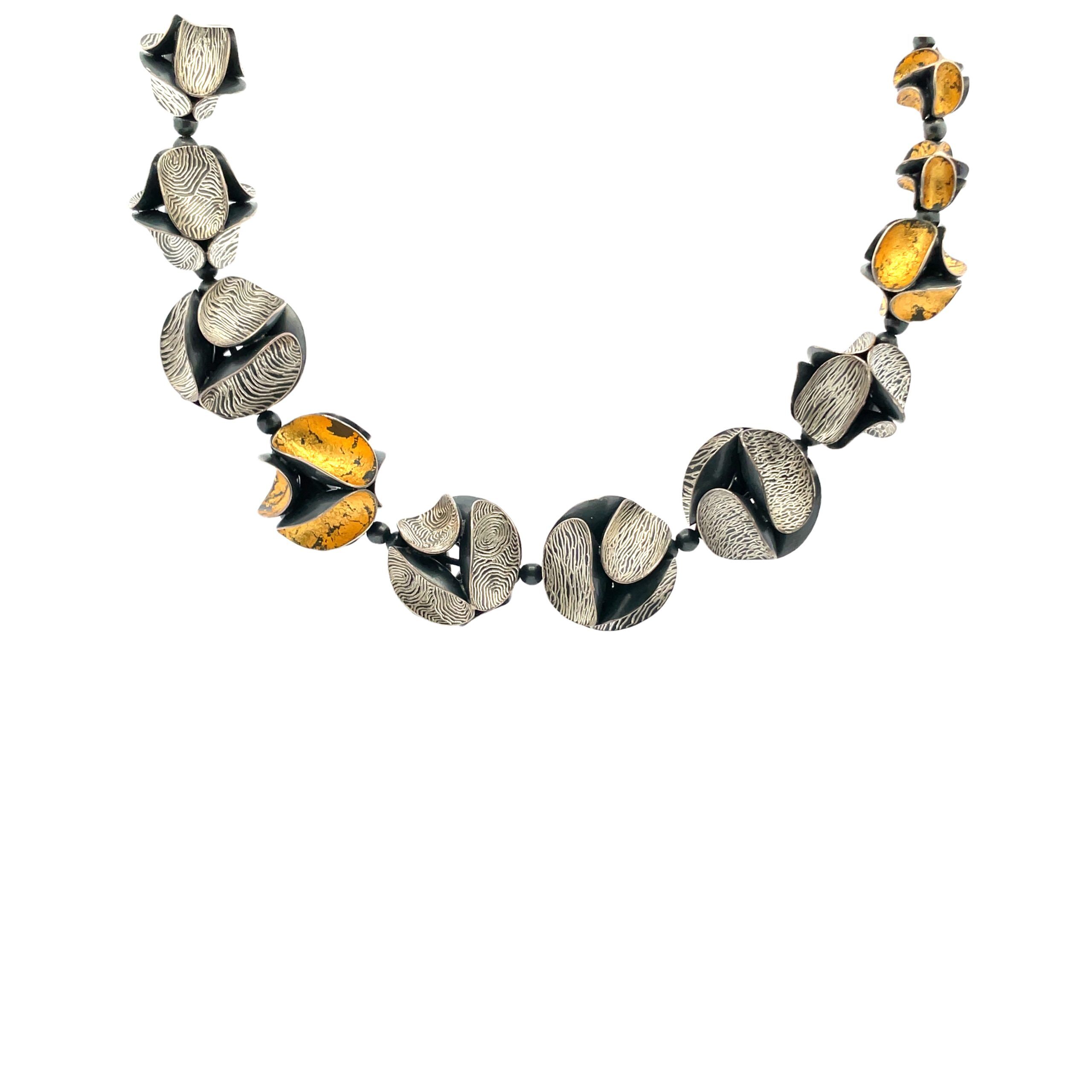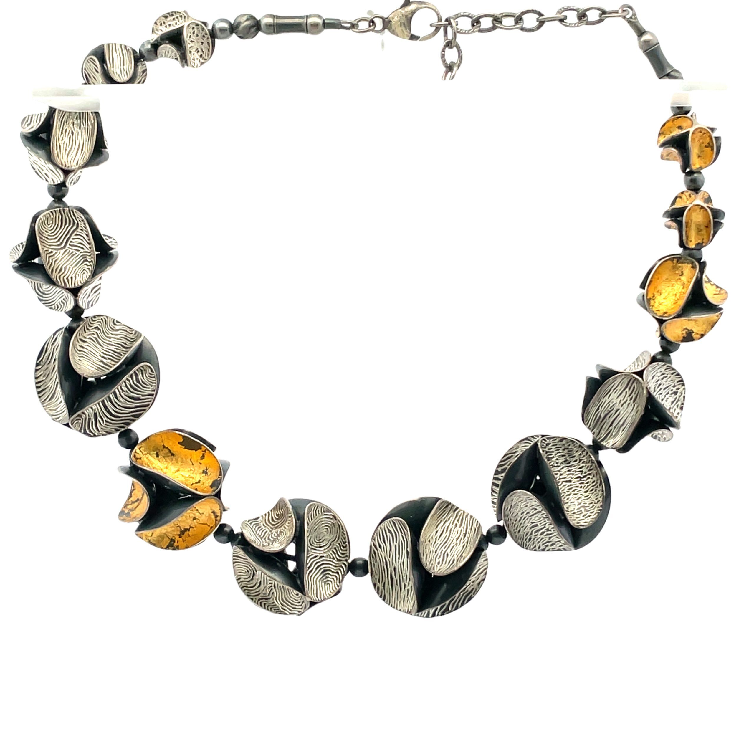 So Young Park’s graduated bead necklace is a tour-de-force of metalsmithing, each 6-sided bead created by hand in sterling silver, either oxidized and engraved or gilded in 24K gold foil in the Korean keum-bo technique. The beads graduate from 13mm at back to the large center beads measuring 17mm diameter each composed of oxidized sterling curved circles. The necklace is reversible and adjustable in length from 16″ to 18″.