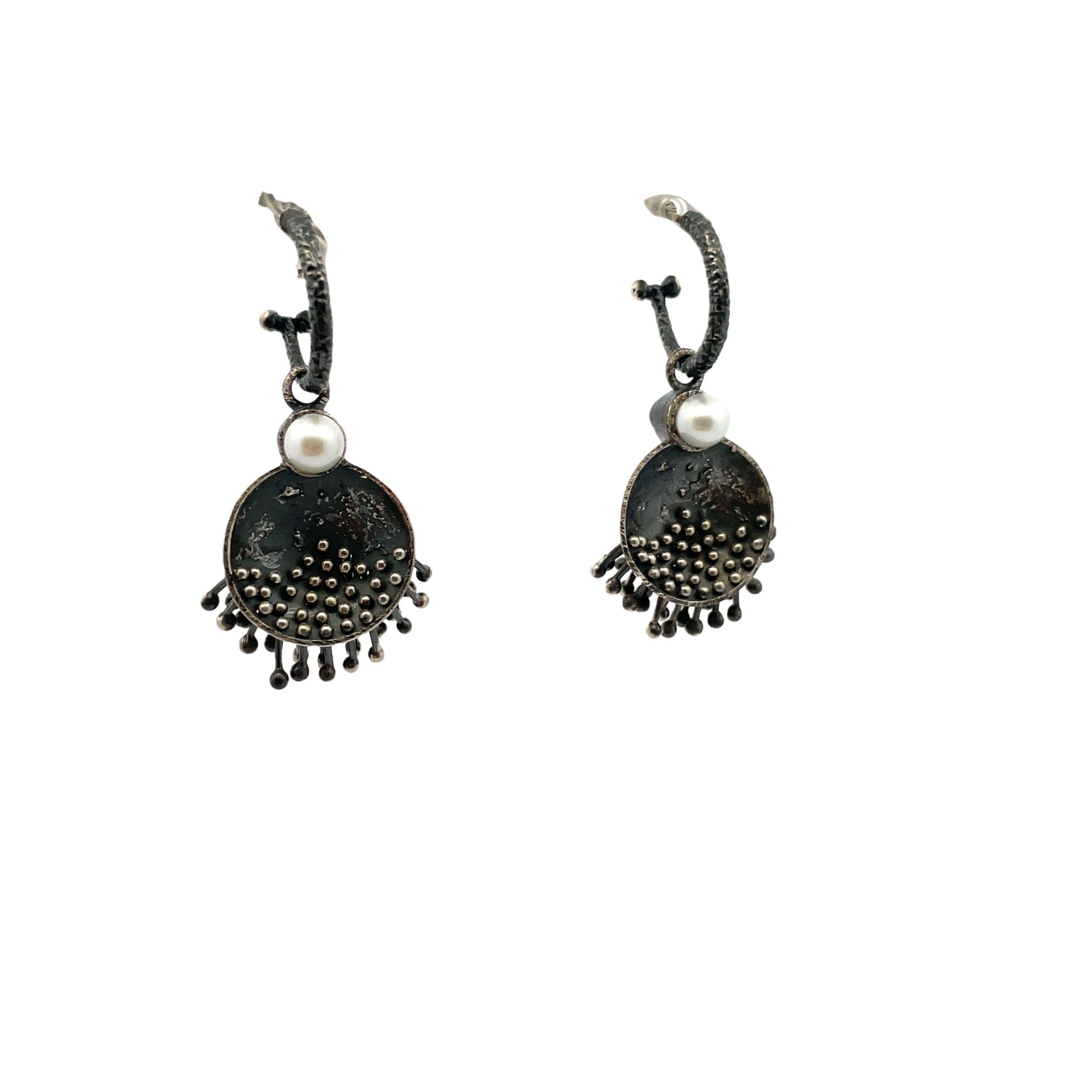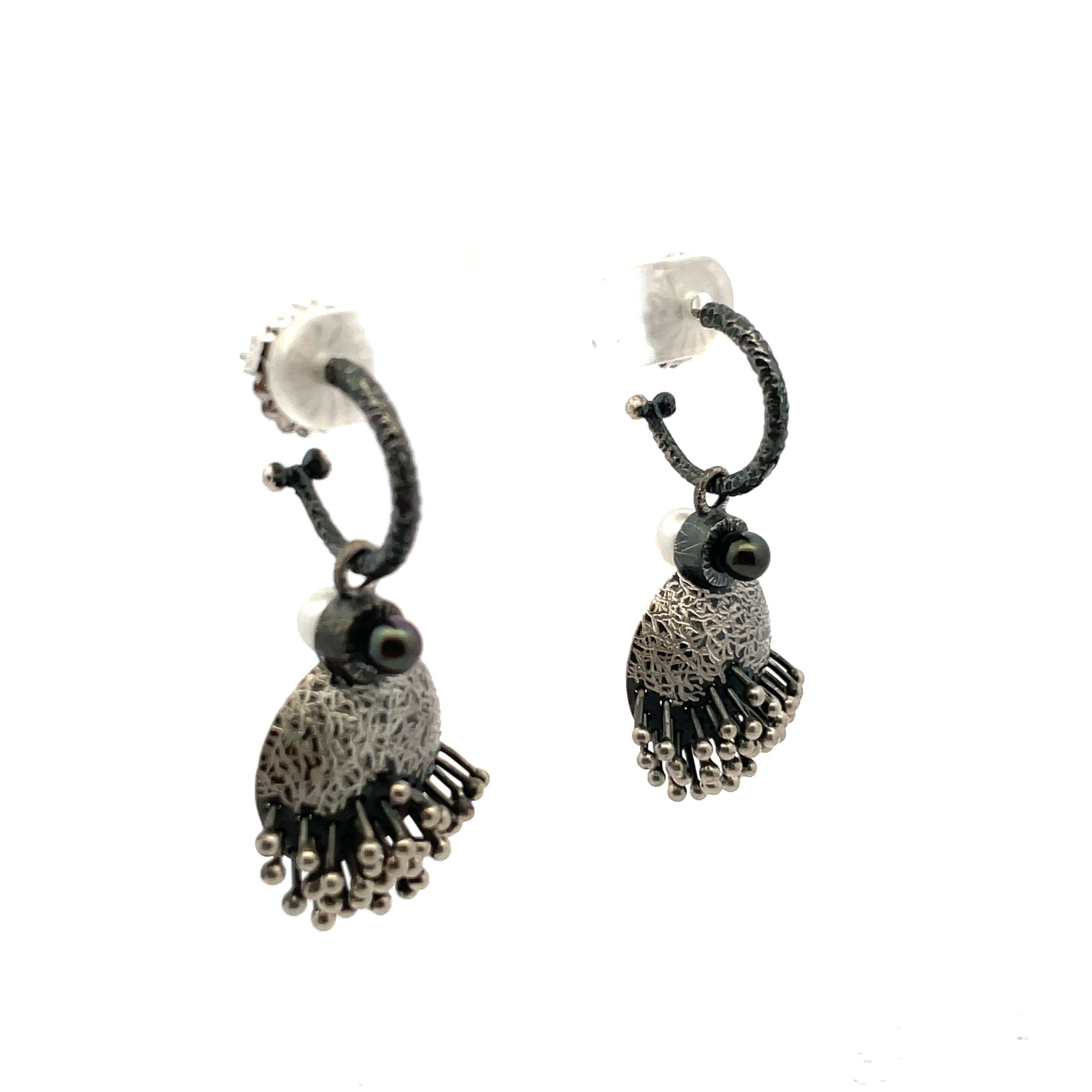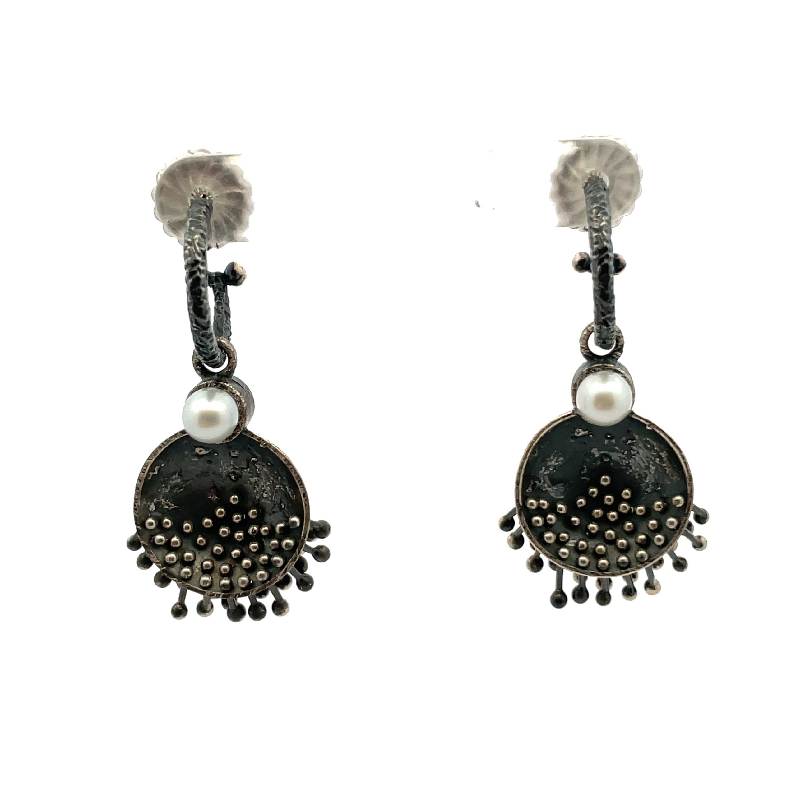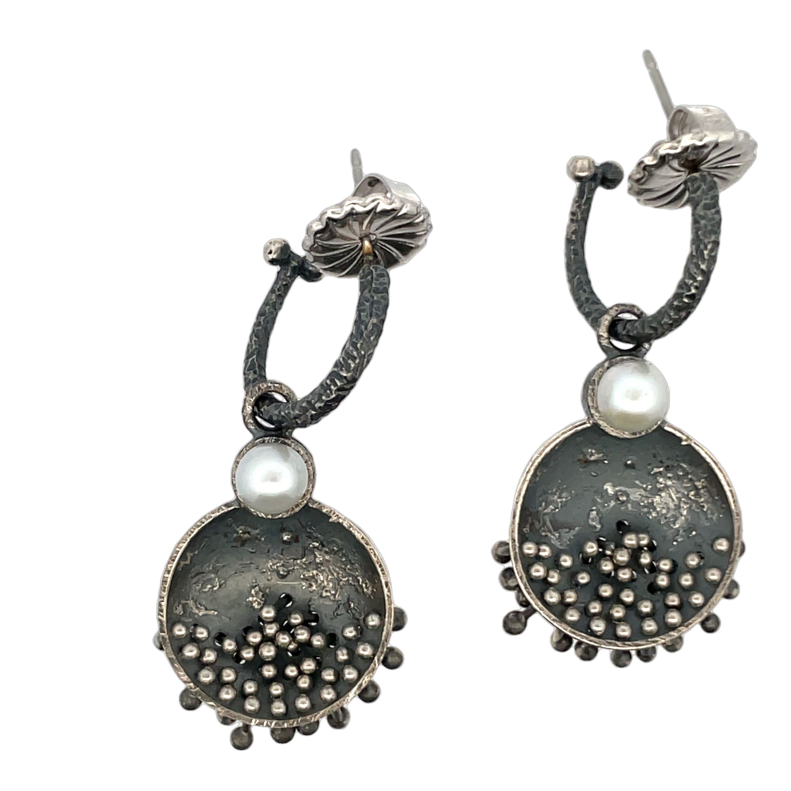So Young Park’s black-and-white day-night earrings can be worn with the black or white freshwater pearl at front or as textured sterling ear hoops only. The sterling discs at bottom are pierced for the movable sterling ‘pins’, convex with white freshwater pearls and convex for black pearls. Little hoops measure 1/2″ diameter, 1-1/2″ long overall with drops. Sterling posts and backs.