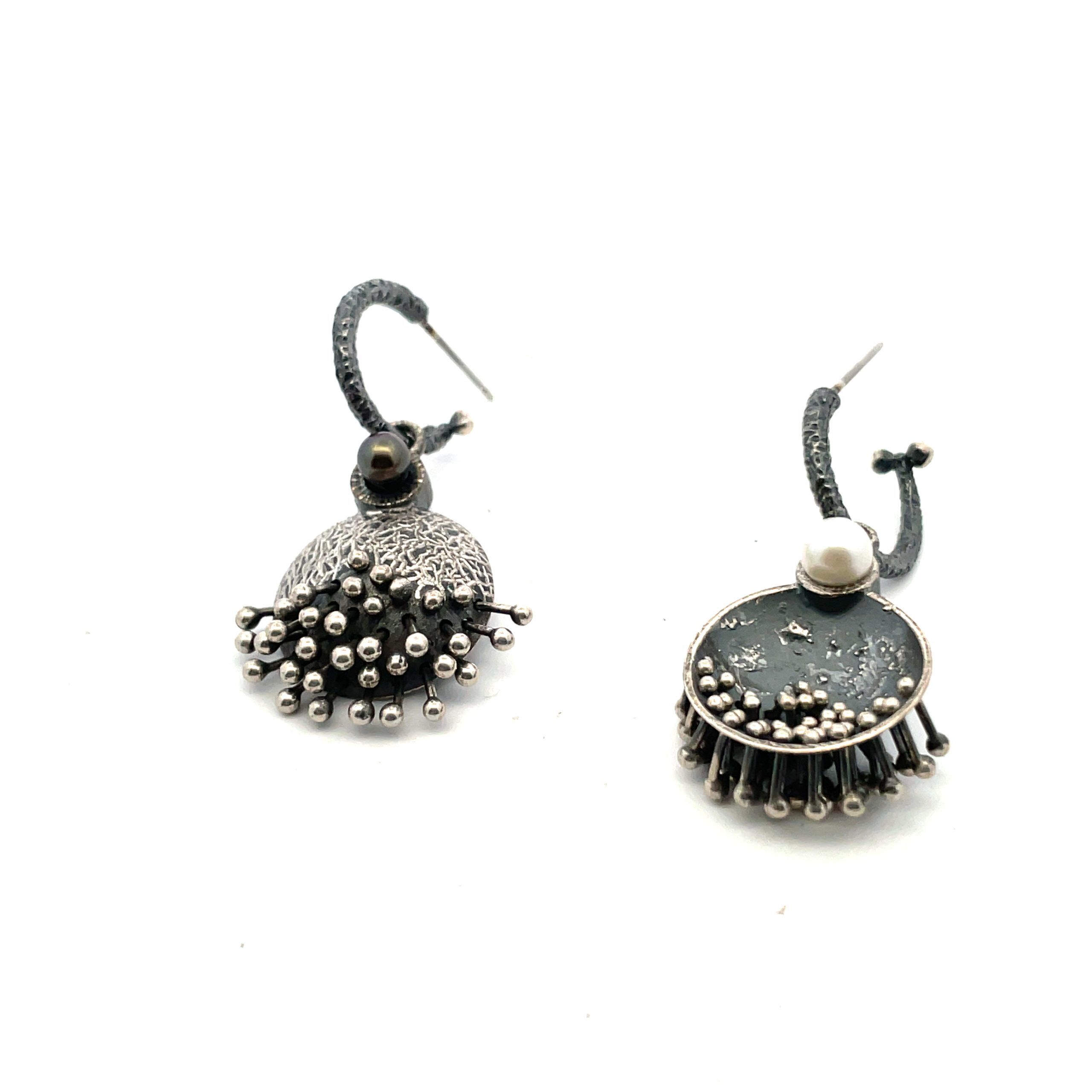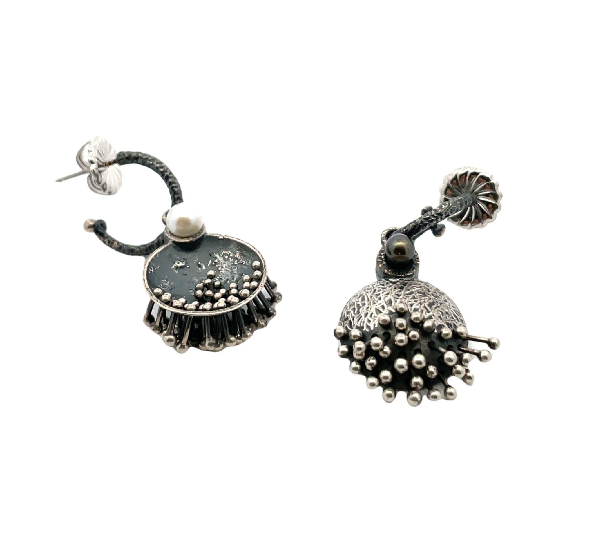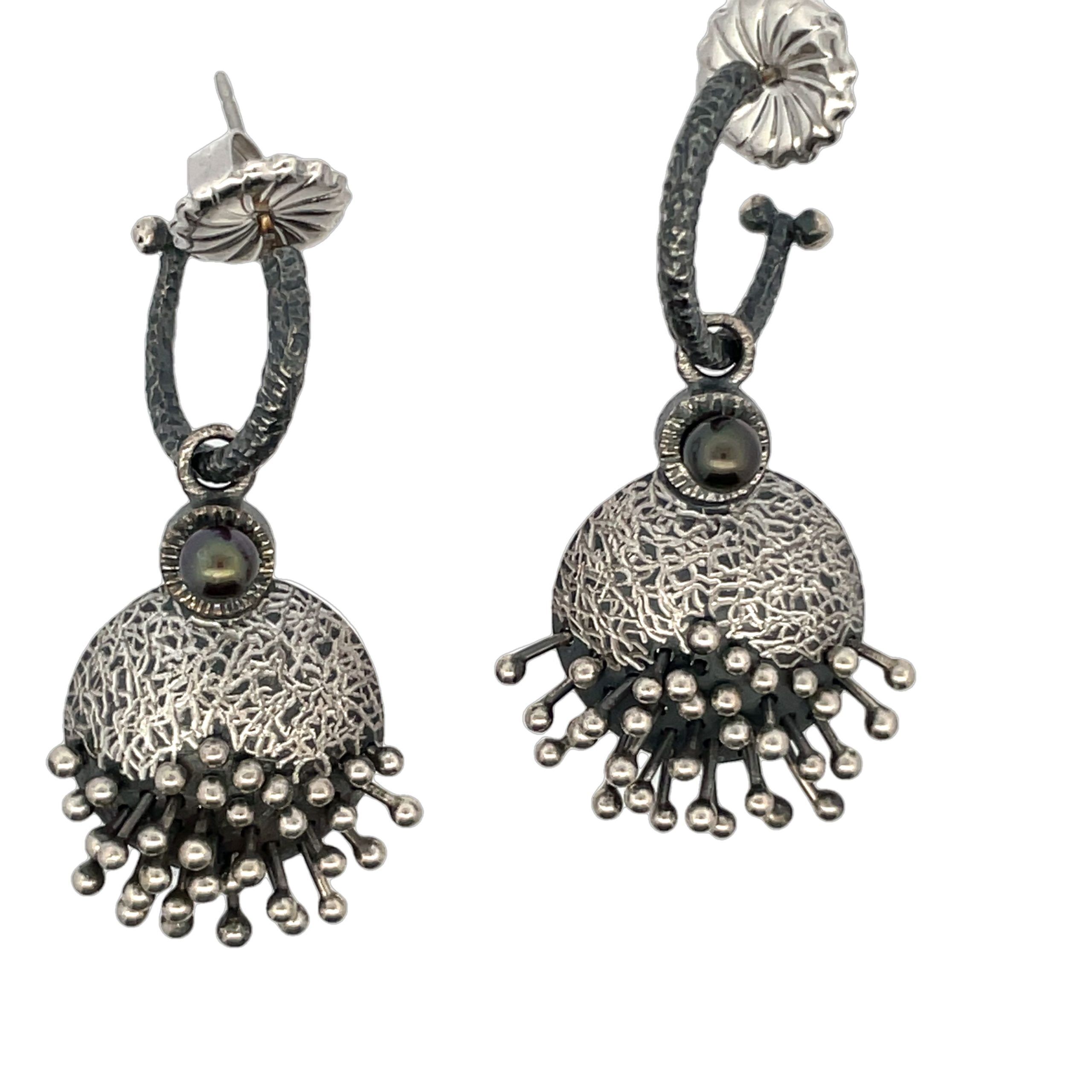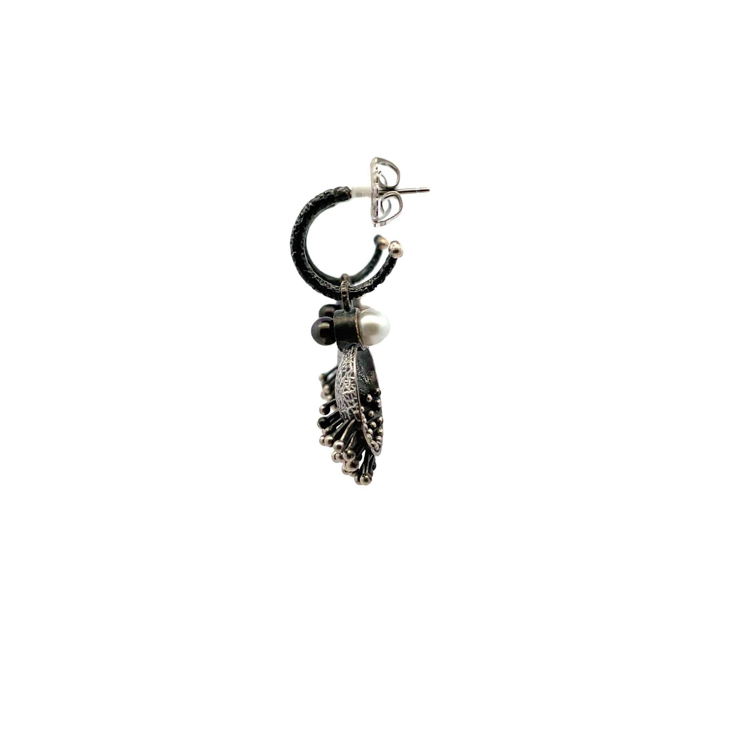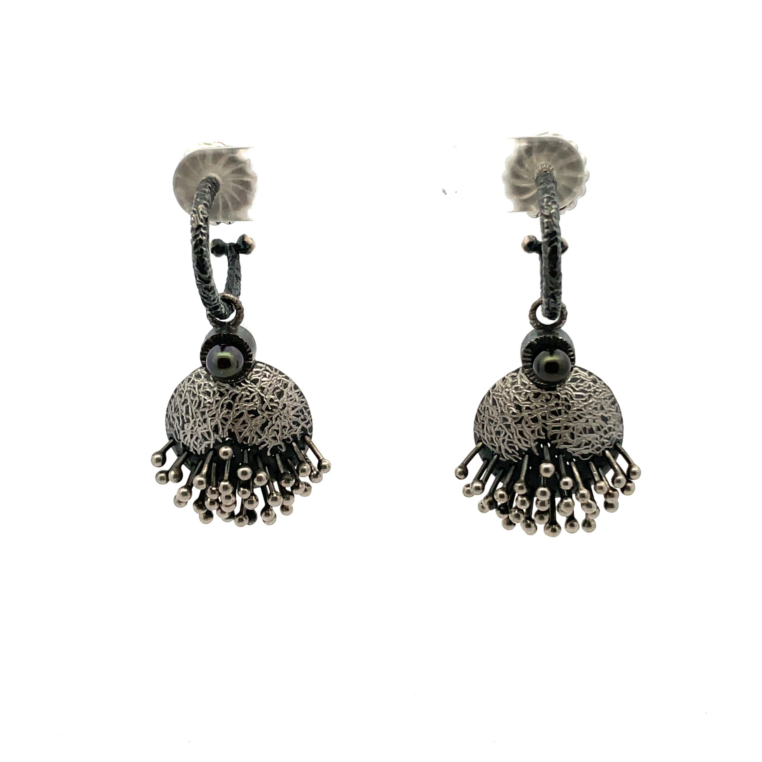 So Young Park’s black-and-white day-night earrings can be worn with the black or white freshwater pearl at front or as textured sterling ear hoops only. The sterling discs at bottom are pierced for the movable sterling ‘pins’, convex with white freshwater pearls and convex for black pearls. Little hoops measure 1/2″ diameter, 1-1/2″ long overall with drops. Sterling posts and backs.