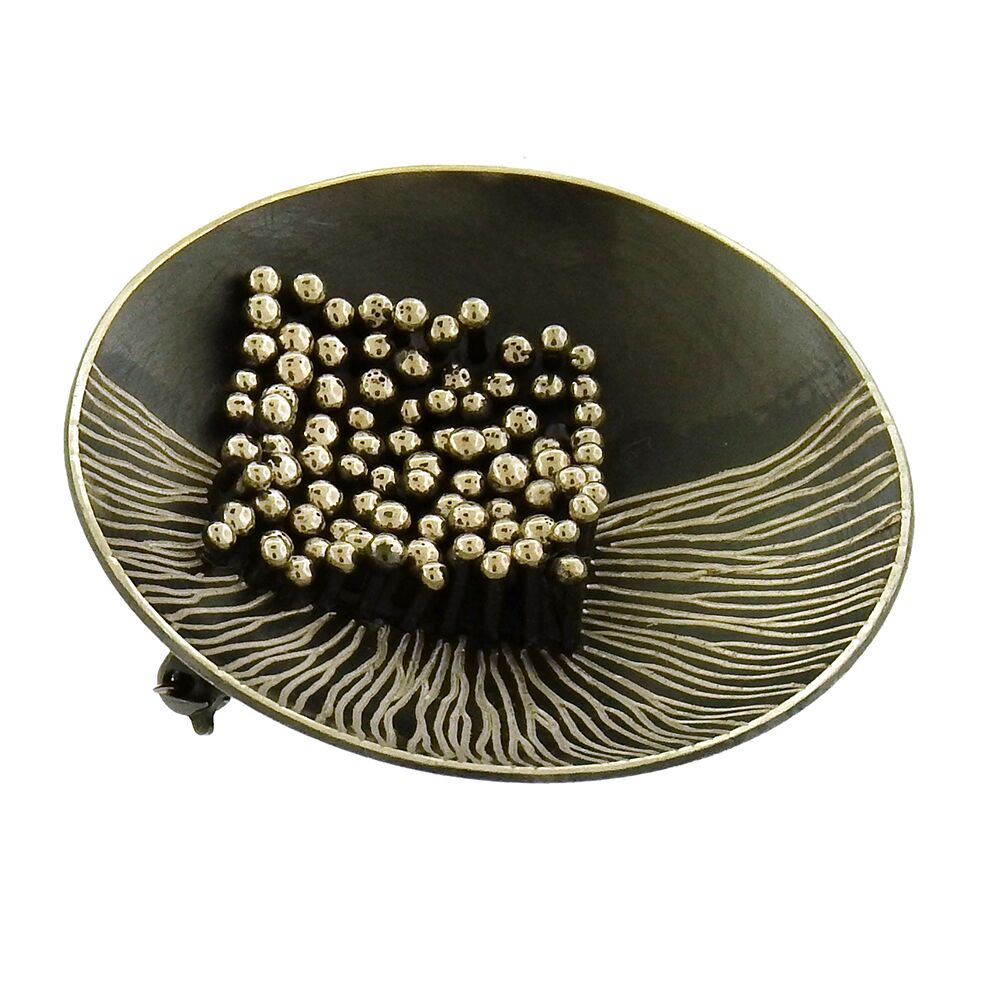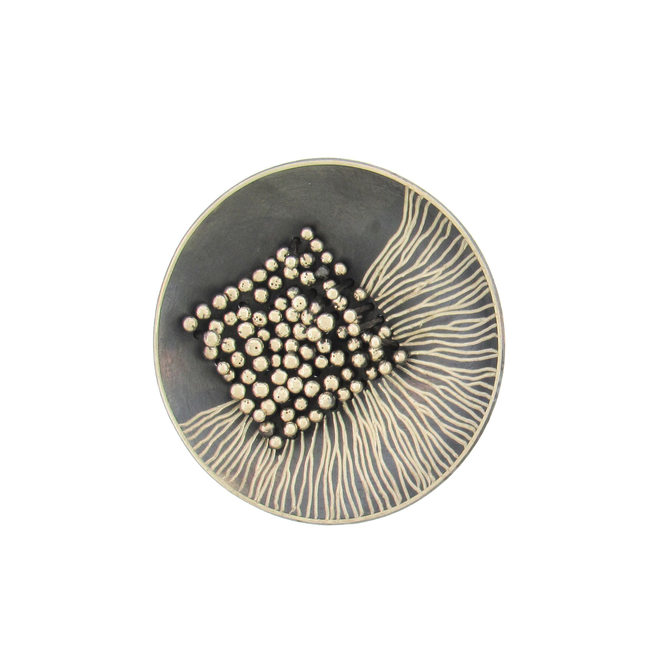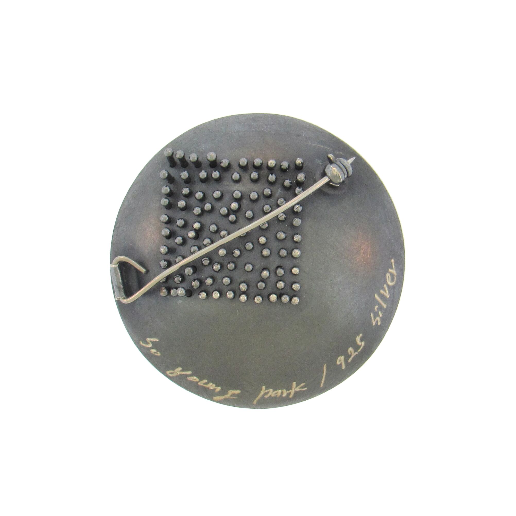 So Young Park’s sculptured round concave brooch, 1-1/4″ diameter, is set off-center with a square field of beaded silver, the half circle etched in radiant lines.