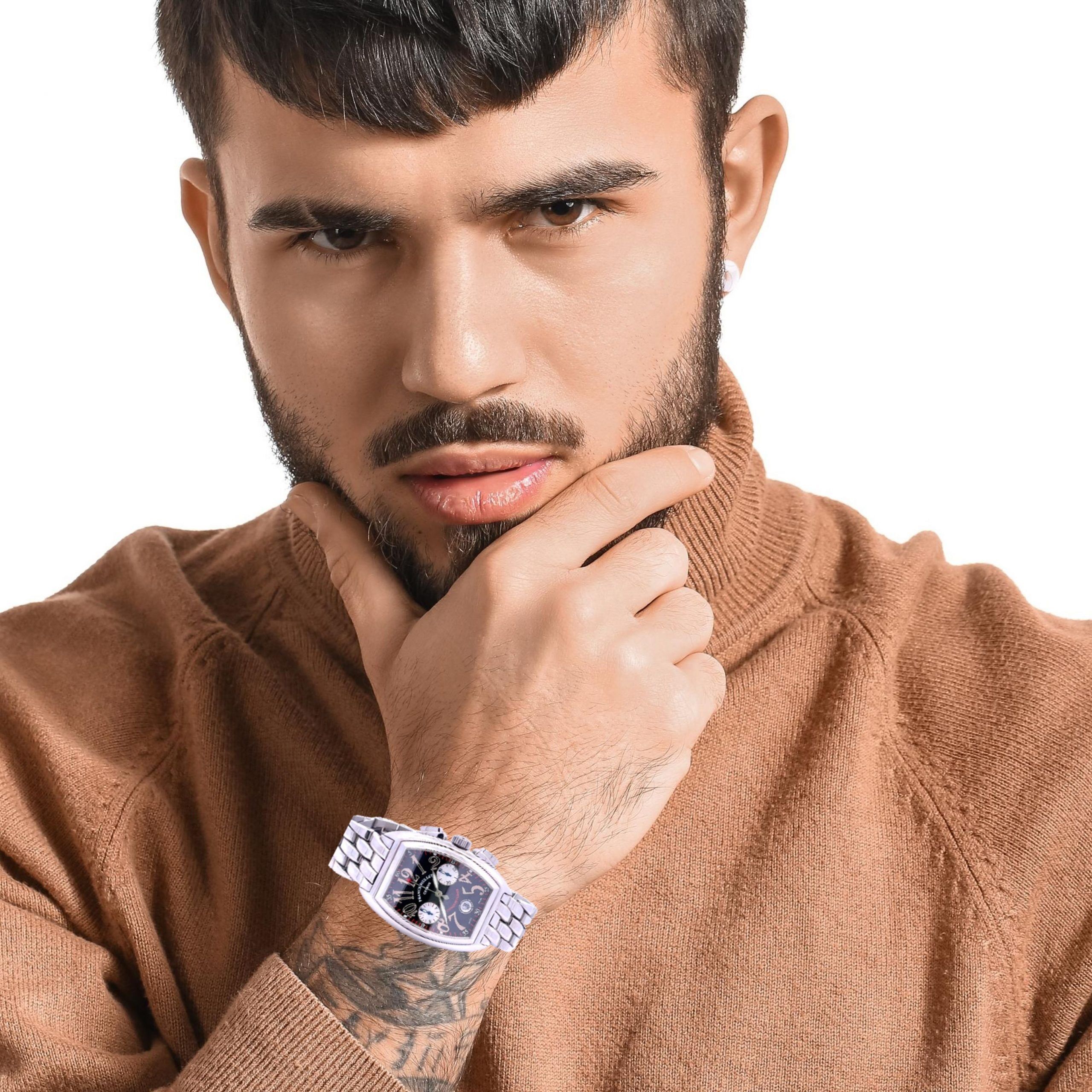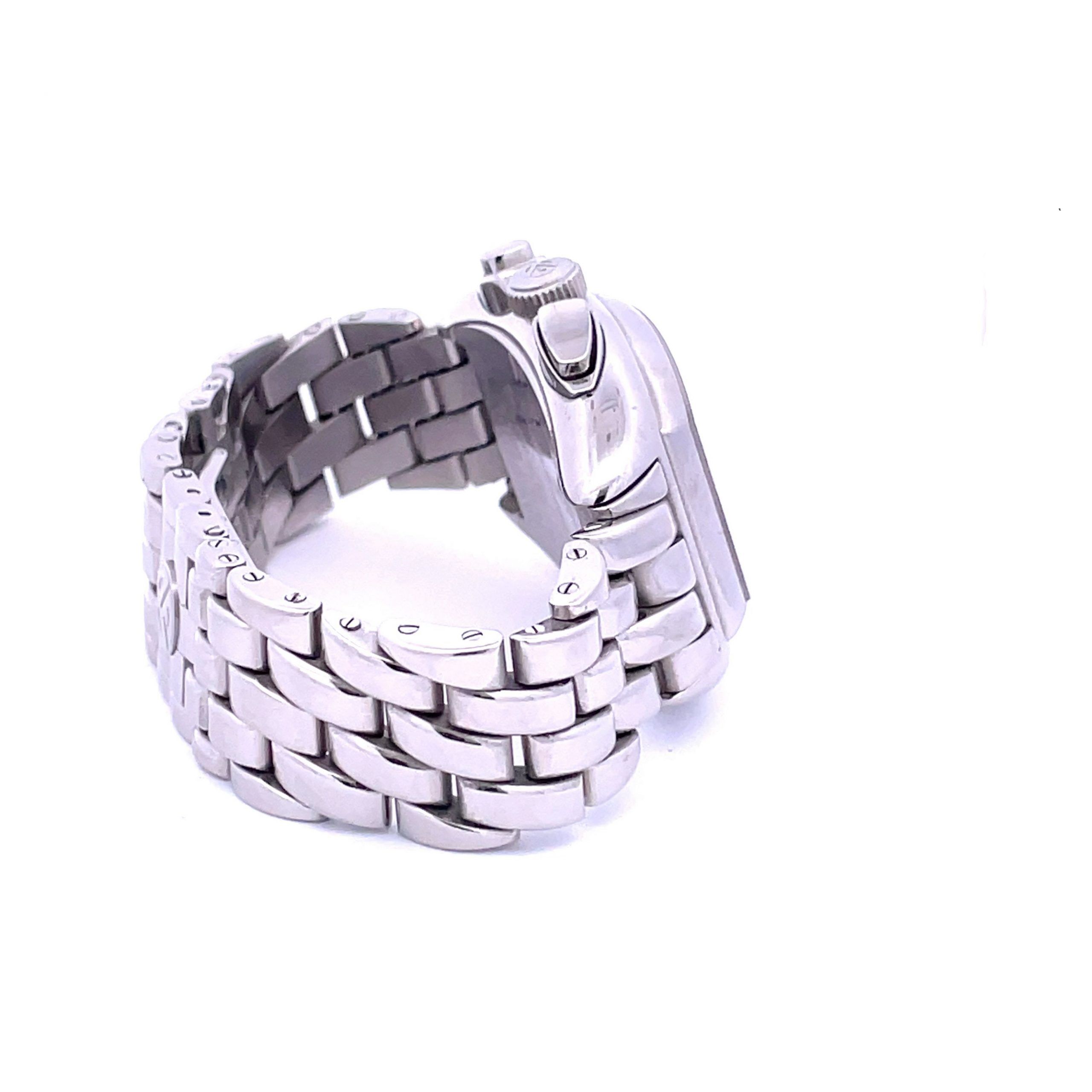 Stainless steel Franck Muller, Genève, Conquistador, Ref. 8002 CC, made circa 2000’s, is a 34mm x 49mm tonneau-shaped and curved, self-winding, water-resistant oval-button chronograph, with register, date and a stainless steel Franck Muller bracelet with fliplock clasp. The black and silver guilloche dial features luminous applied radial Arabic numerals, subsidiary dials for the 30-minute and 12-hour registers, aperture for the date at 6, and luminous leaf hands. The caliber 1185 37 jewel automatic movement is warrantied by Aaron Faber for 2 years.