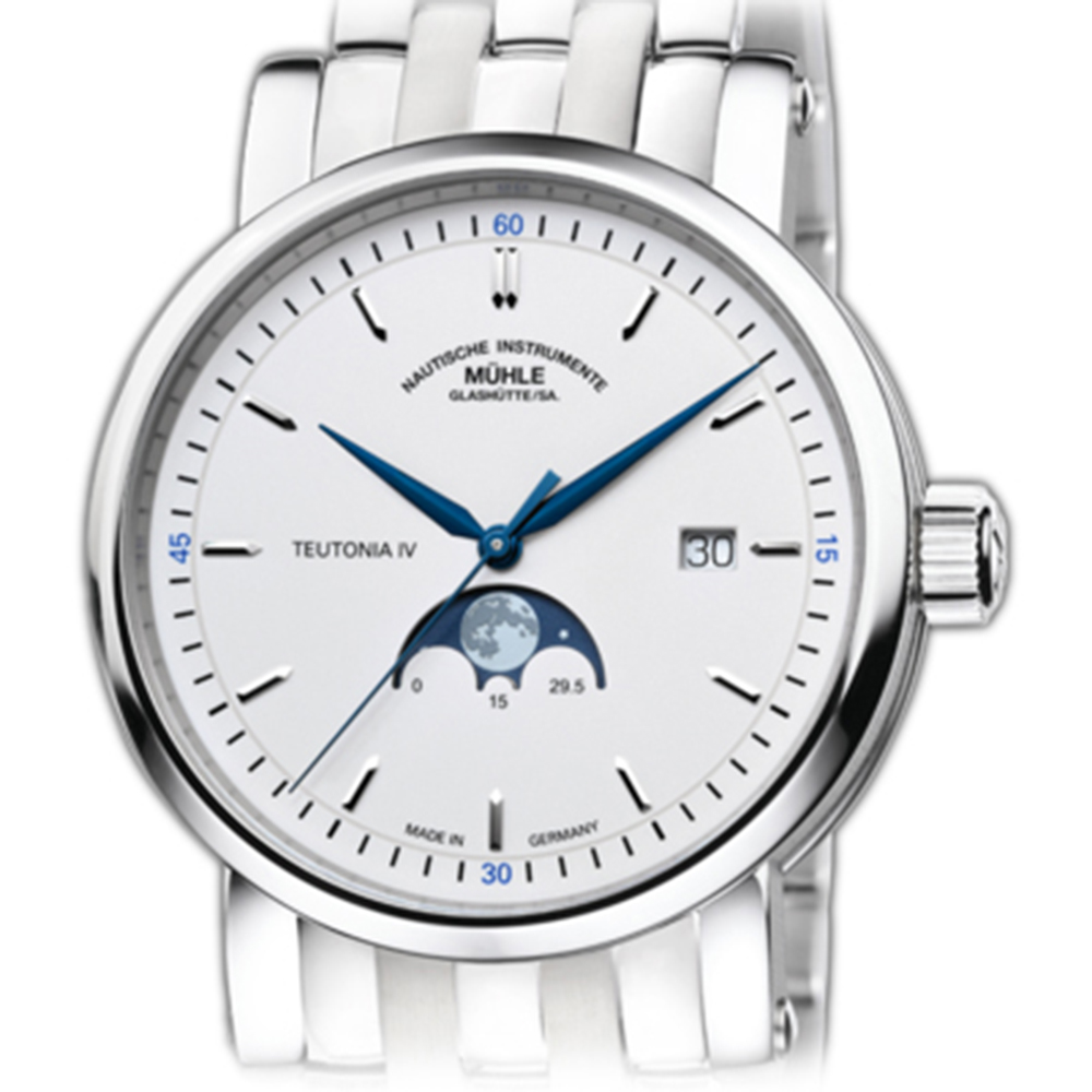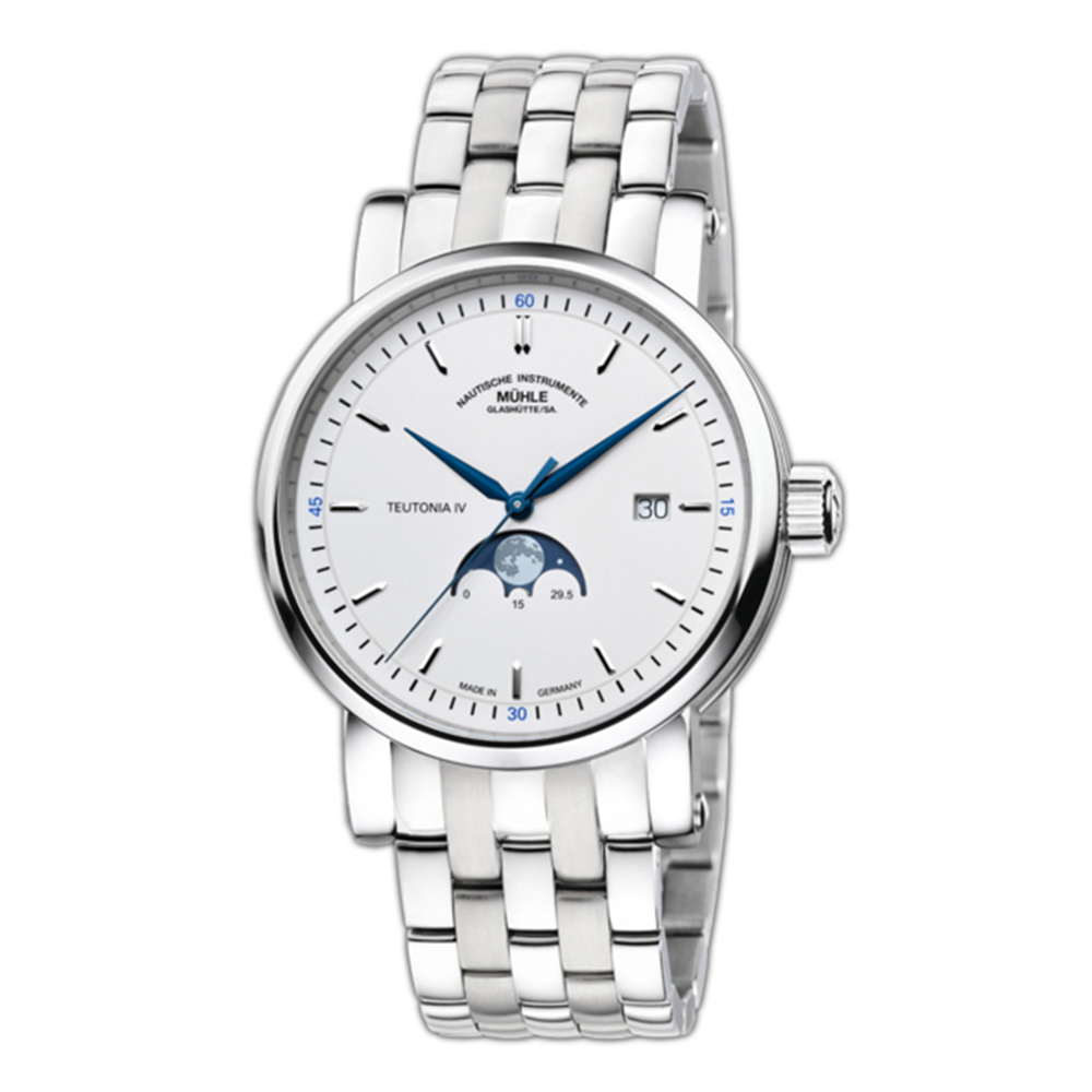 Stainless steel Muhle Glashutte Teutonia IV moon phase automatic is a 41mm round automatic with see-through back, white dial with applied hour indexes, moon phase at 6, date at 3, sapphire crystal, The lunar display contains two images of the moon in order to provide a realistic day-by-day insight into the transition from new moon to full moon and back to new moon, over a period of approx. 29.5 days, thus it takes the disc 59 days to complete a full cycle. Stainless steel bracelet with deployant clasp. Fast date and moon-phase correction. 38-hr power reserve. The 38 hour power reserve movement is warrantied by Muhle for 2 years.