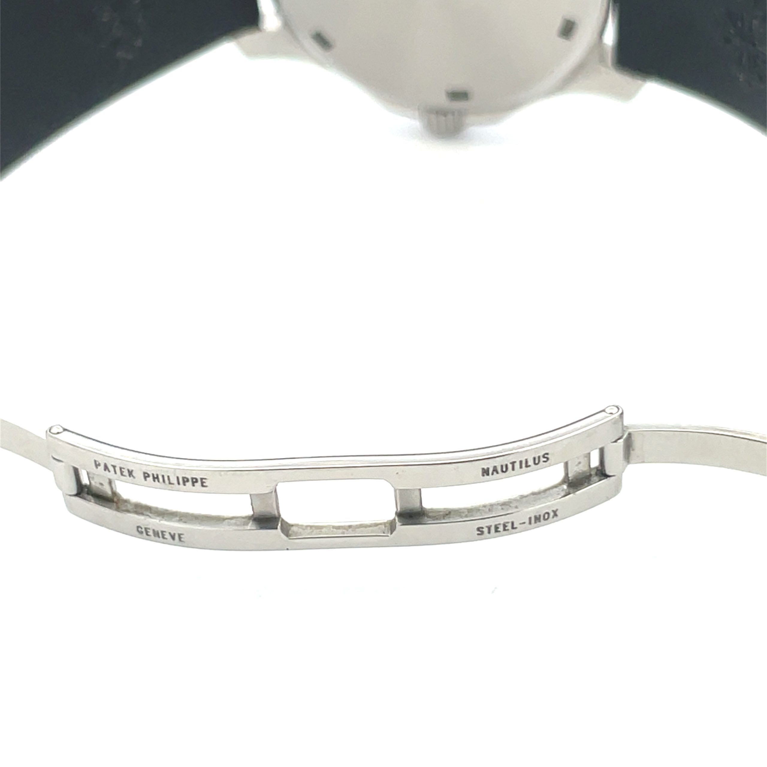 Stainless steel Patek Philippe Aquanaut, Ref. 5060A, circa 1998, is a collector’s find, the first Aquanaut produced, with the clasp inscribed ‘Nautilus’, as Patek developed the new brand. Its successor Ref. 5066A, debuting in 1998, the new 5066A would inscribe the clasp ‘Aquanaut’. The 5060A is a steel 35mm cushion-form watch with screwed-down case back, flat matte bezel, checkerboard black dial with cream luminous hour markers, applied matte steel Arabic numbers, water-resistant, with an automatic movement warrantied by Aaron Faber for 2 years. Accompanied by original certificate, wallet, booklets, and stainless steel Patek Philippe bracelet.