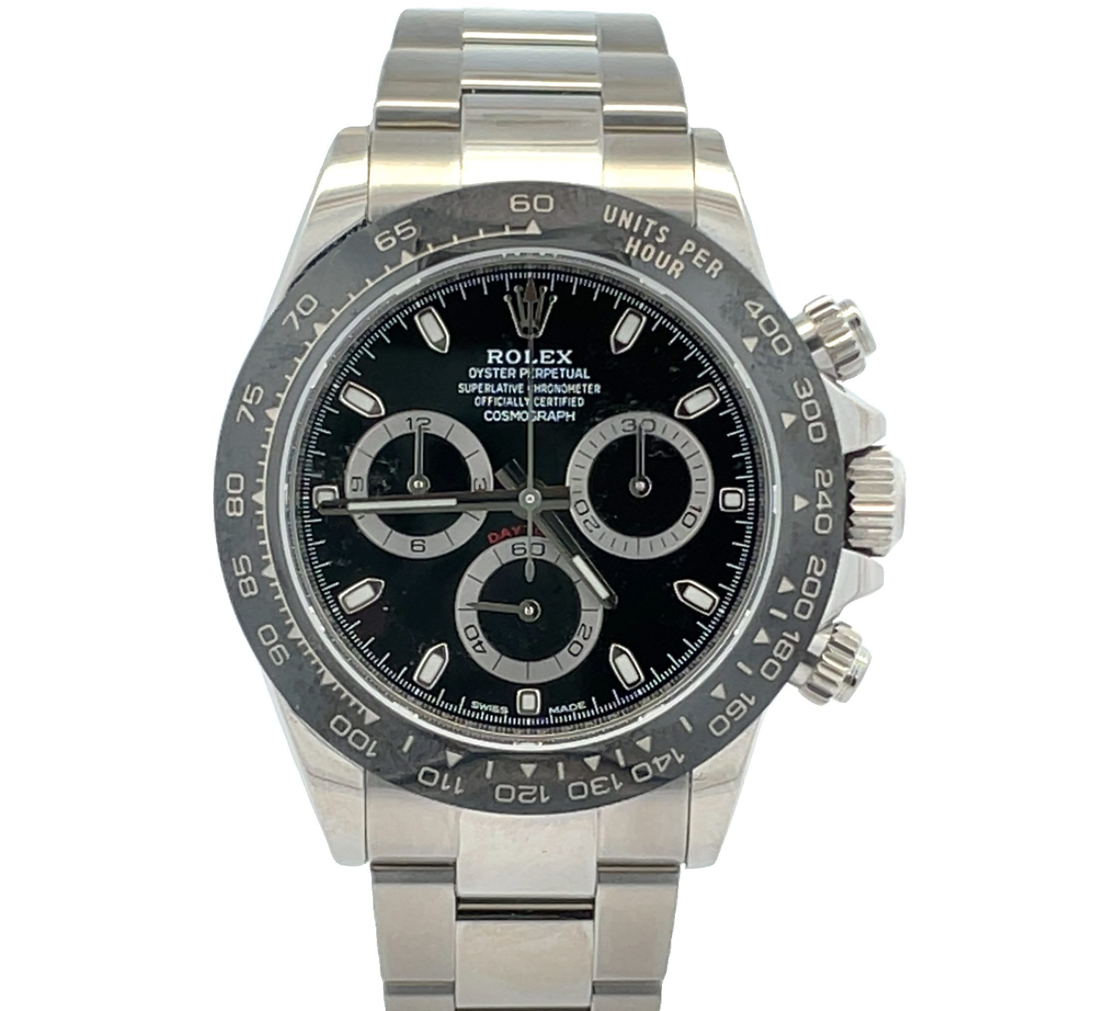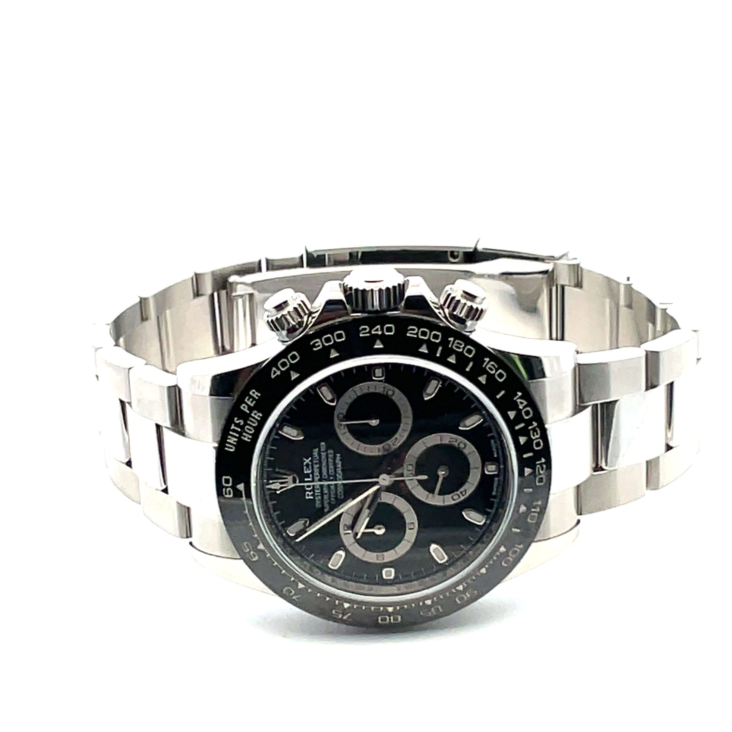 Stainless steel ceramic bezel Rolex Daytona Ref. 116500LN, made in 2020, is a pre-owned, excellent condition automatic chronograph with steel Oyster bracelet.. The 40mm case has a screw-down back, ceramic bezel, black dial with silver registers, caliber 4130 automatic movement with 72 hour power reserve, and original box and card. The movement is warrantied by Aaron Faber for 2 years.