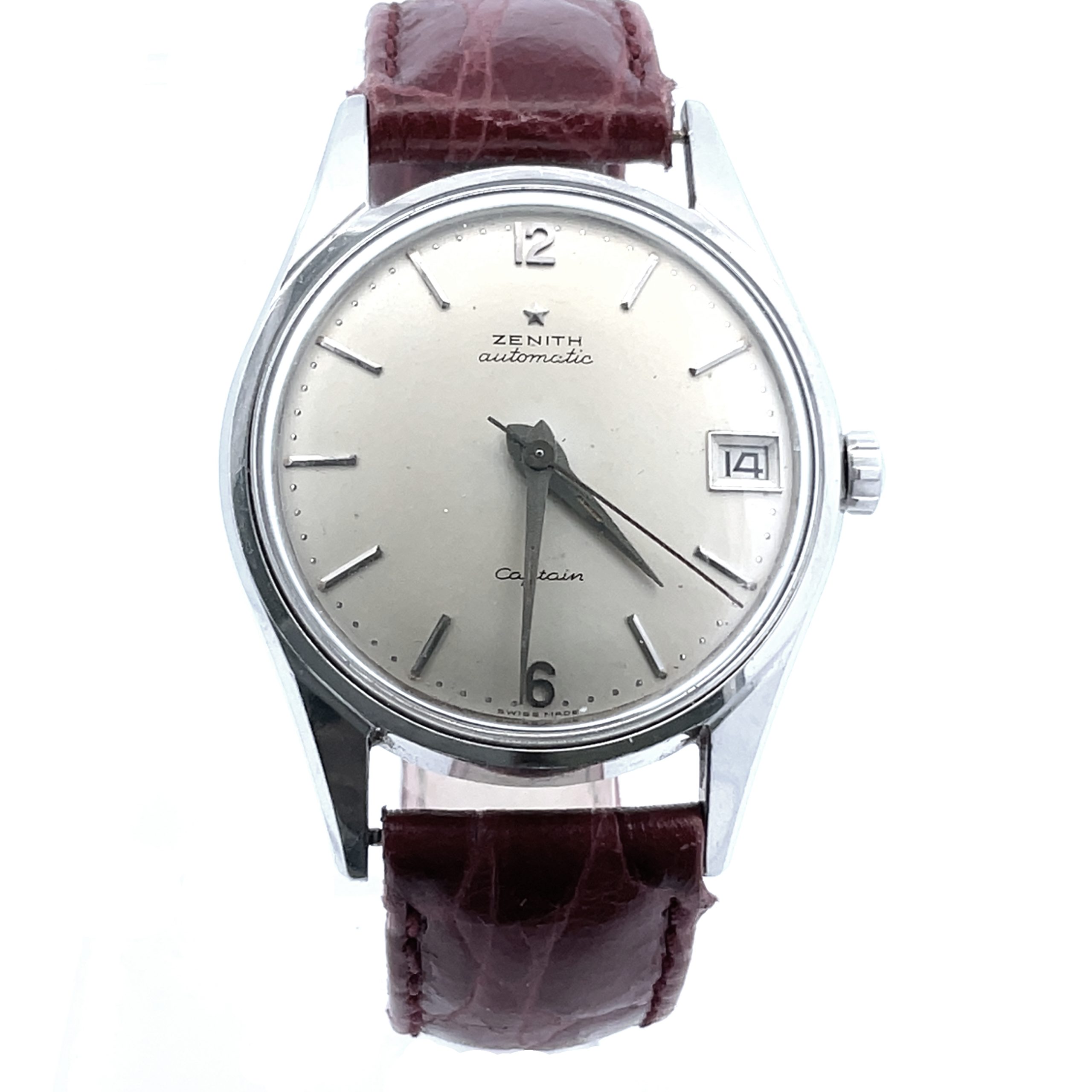 Rare stainless steel early Zenith Captain automatic wristwatch, circa 1950, 36mm, with center second sweep hand, ecru-color patinated silvered dial with ‘Captain’ signature, applied steel markers, steel luminous dauphine hands, screwed-down case back. Automatic movement warrantied by Aaron Faber for 1 year.