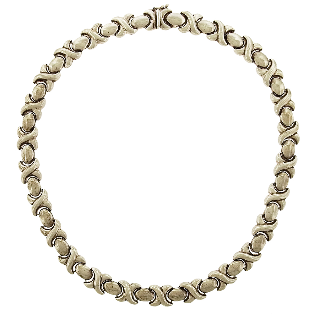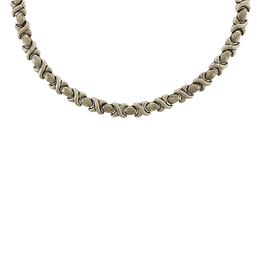 Solid sterling silver necklace made in Italy, alternating oval and curved-X shape links, 17″ long.