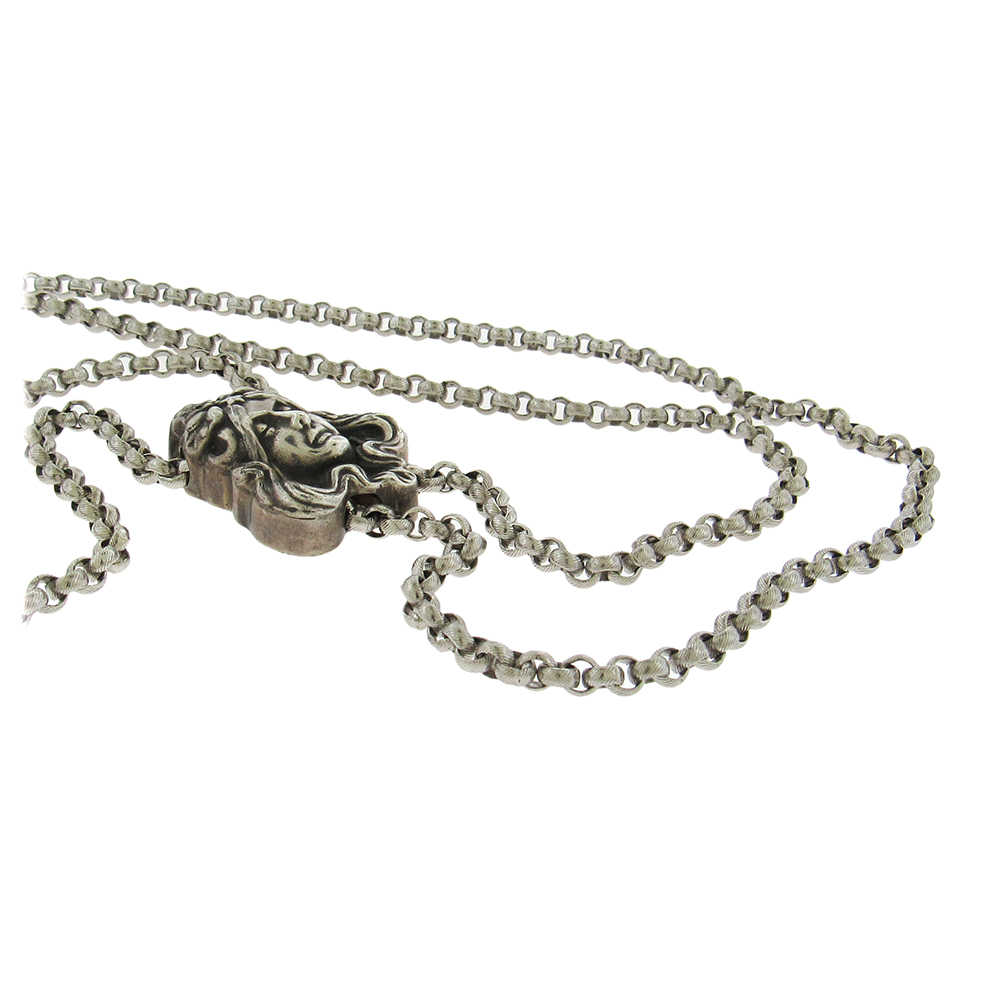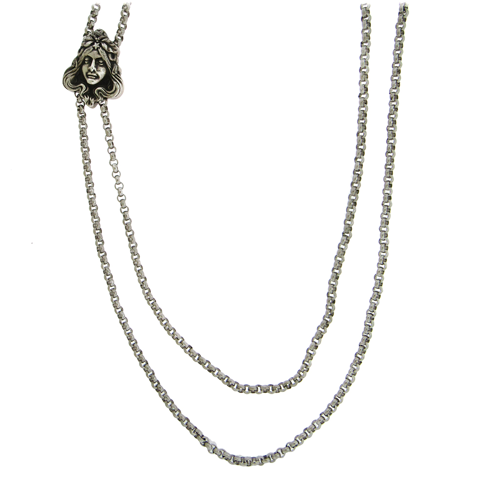 Sterling silver long double rolo chain with Art Nouveau portrait slide, is 32″ long doubled. The slide measures 1-1/8″ x 1-1/2″.
