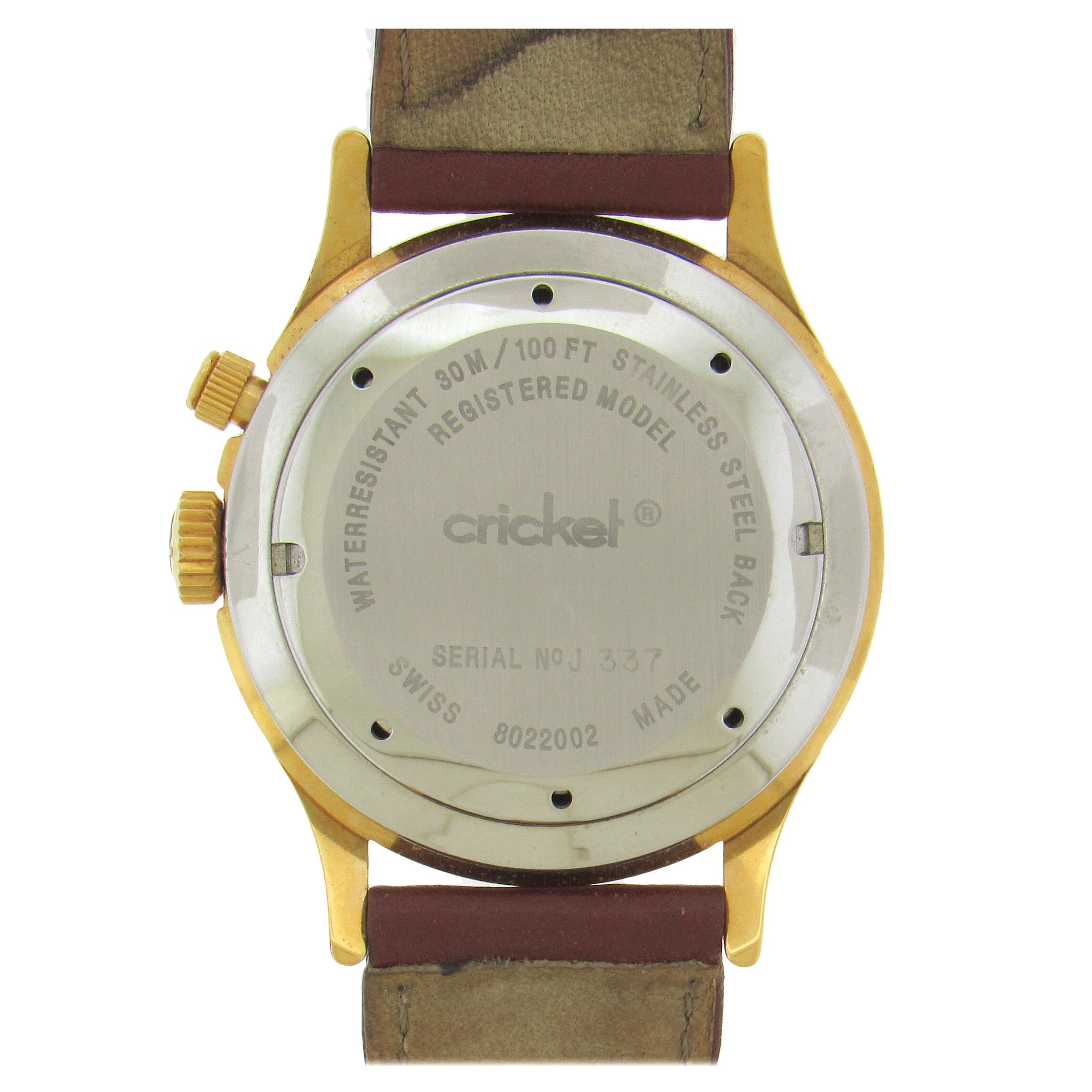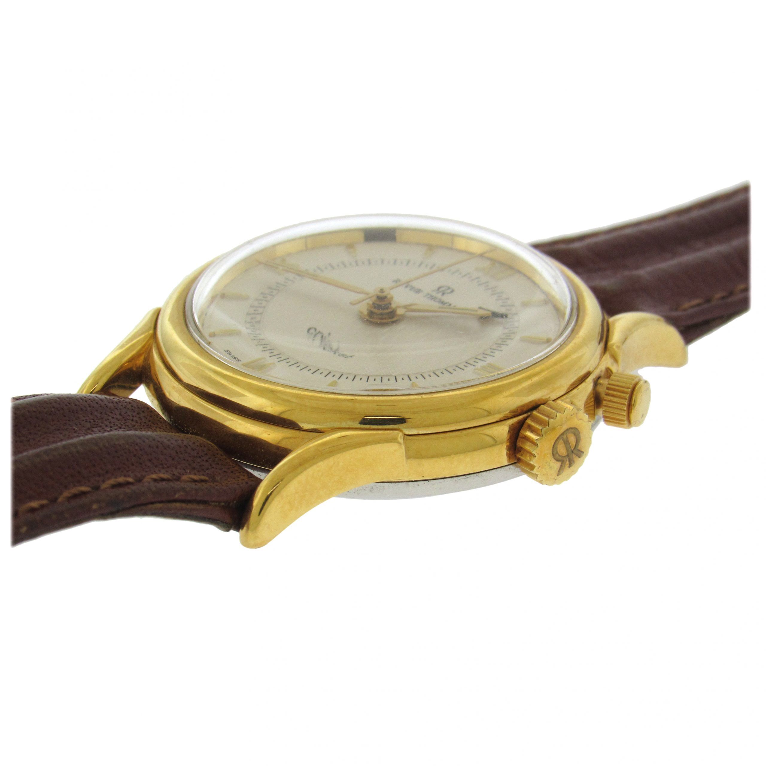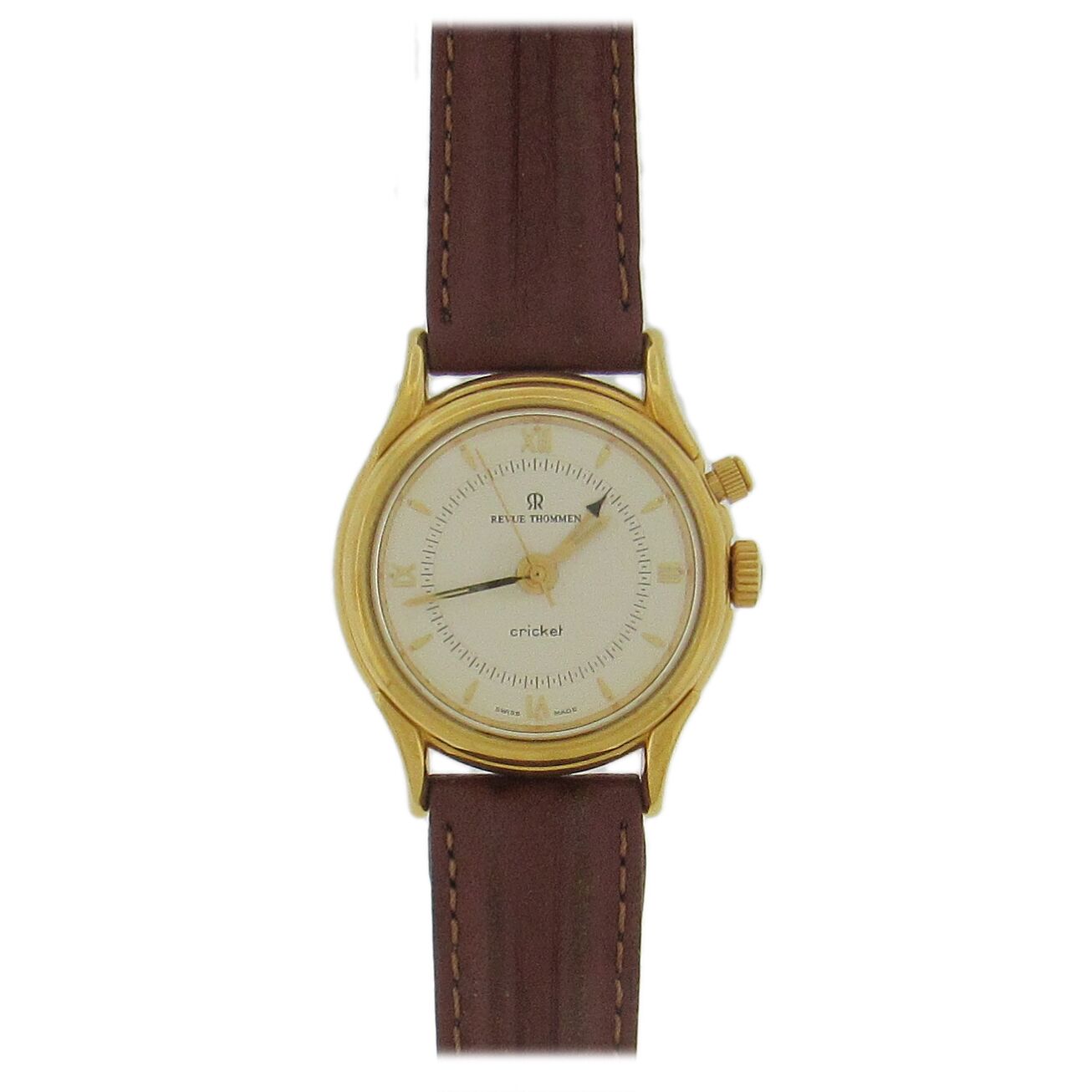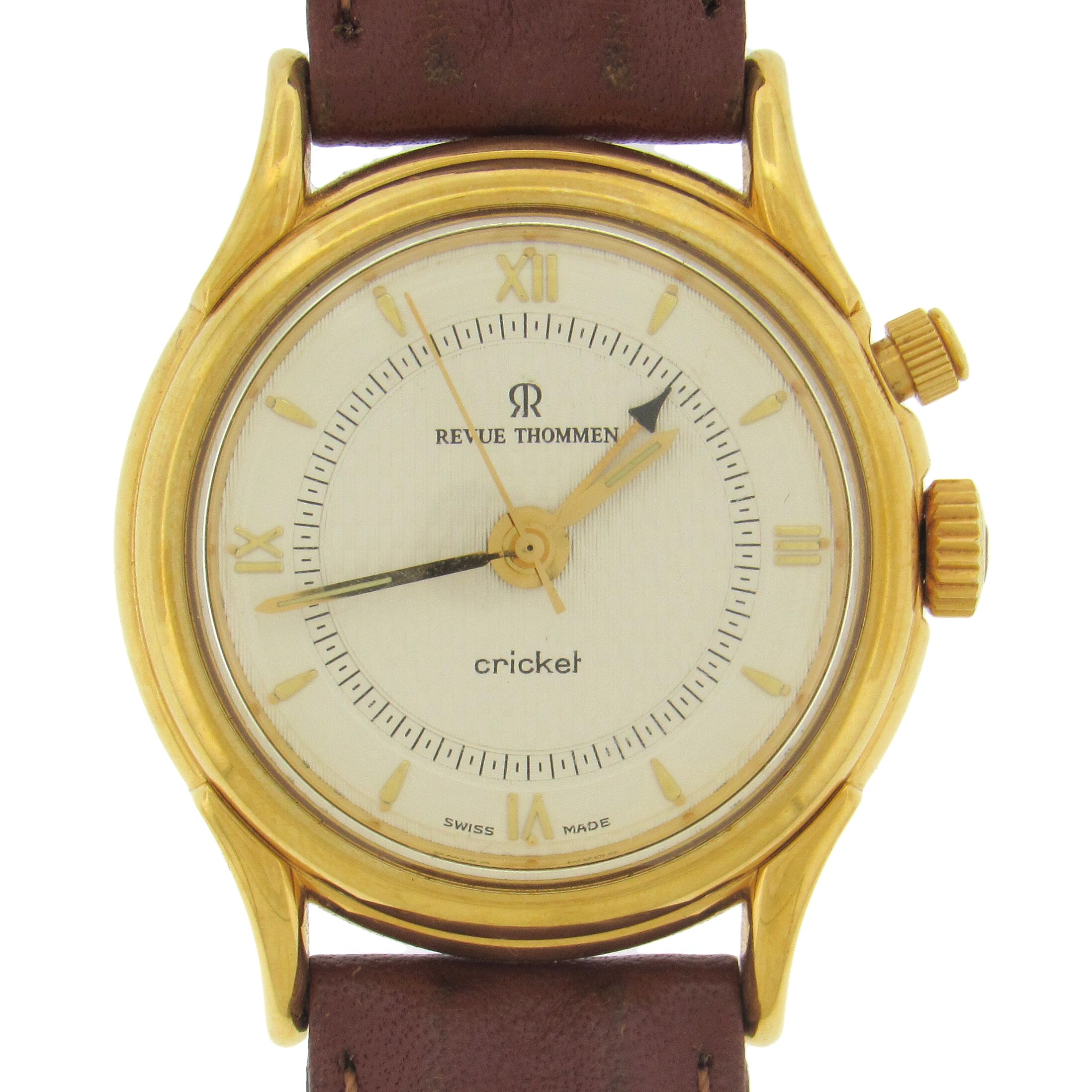 Circa late 2000’s very good condition steel Revue Thommen Cricket, a 35mm mechancial alarm watch, screwed-down steel back, gold-filled top, two-tone silvered dial with engine-turned center and outer reserve, applied gold-filled Roman numerals and teardrop hour markers, original buckle, manual wind movement warrantied by Aaron Faber for 1 year.