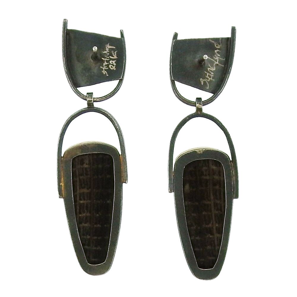 Nature is Sydney Lynch’s inspiration and nothing could be more natural than these softly striped fossilized sequoia tree cabochons, set in oxidized sterling, 22K and 18K gold. Earrings measure 1/2″ x 2″ long, sterling posts.