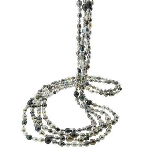 This endless pearl strand,80″ actually,is four strands of Tahitian keshi pearls,4mm to 6mm,in hues of black,gray and white,with the deep luster only seen in keshi pearls. Invisible clasp allows opening to wrap around neck,waist or arm.The luster of keshi pearls comes from having no nucleus,they are 100% nacre.