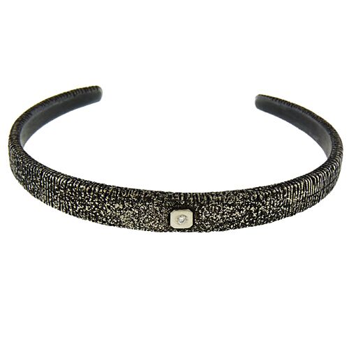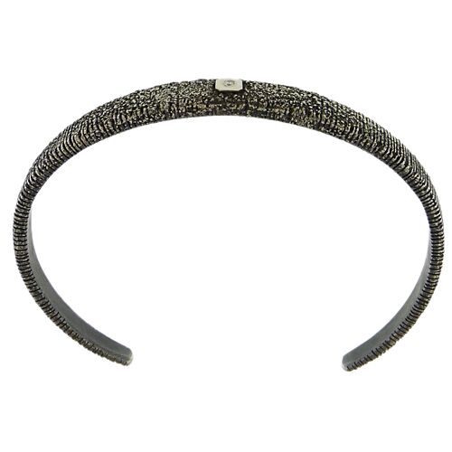 Tai & Tiara created this cuff bracelet for men, in textured and oxidized sterling silver, set at top with platinum and one diamond. Measures 1/4″ across and fits medium to larger wrists.
