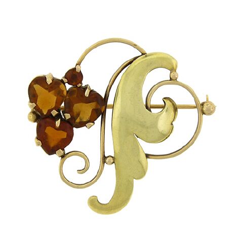 Rare Tiffany & Co 14K yellow gold scrolled floral design, circa 1940’s, notable for its three buff-top heart-shape sherry-color citrines that form the pendant blossom of the pin. Stamped on back Tiffany & Co and 14K. 1-1/2″ h. x 1-5/8″ w.