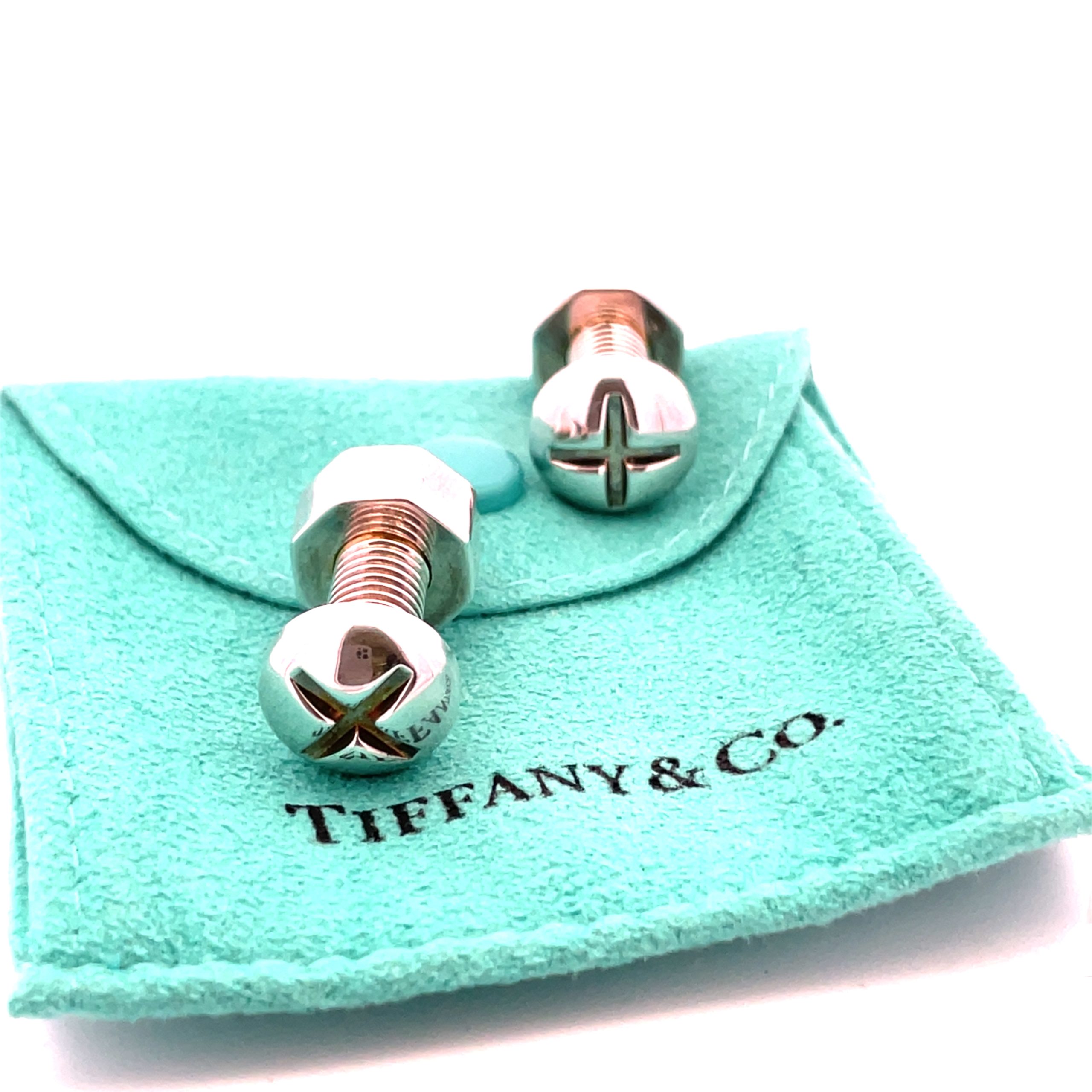 Tiffany & Co estate sterling silver ‘Nuts and Bolts’ cufflinks from a private estate, measure 1/2″ diameter front & back, 7/8″ long. With blue pouch. Circa 1990’s.