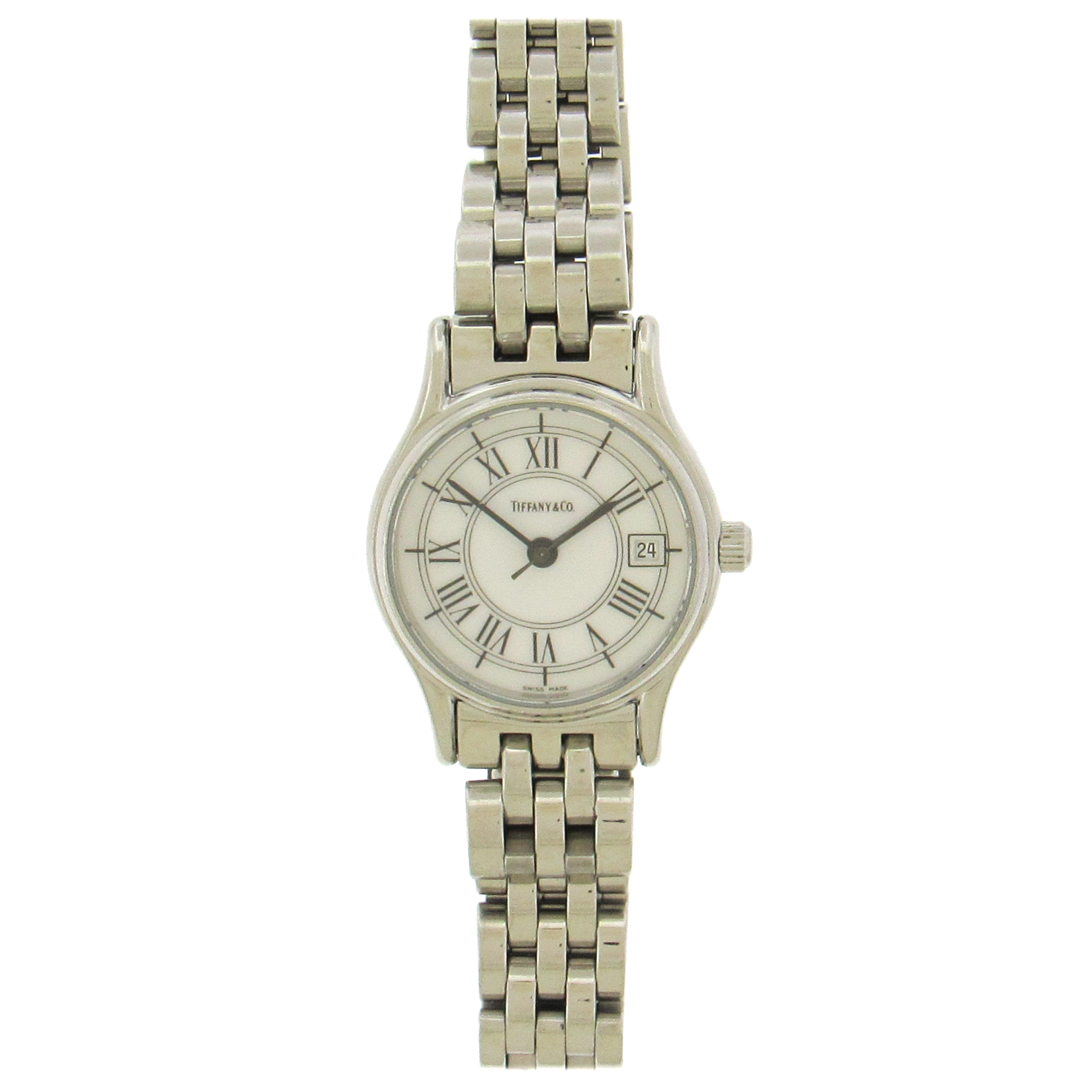 Stainless steel Tiffany & Co women’s classic date wristwatch has a 23mm case, white porcelain dial with black center seconds hand, black baton hands, black Roman numeral painted hours, date window at 3, and Tiffany link double deployant bracelet, fits 6-1/2″. The quartz movement is warrantied by Aaron Faber for 1 year.