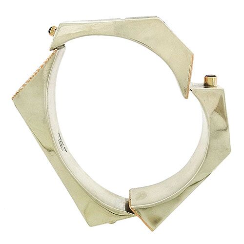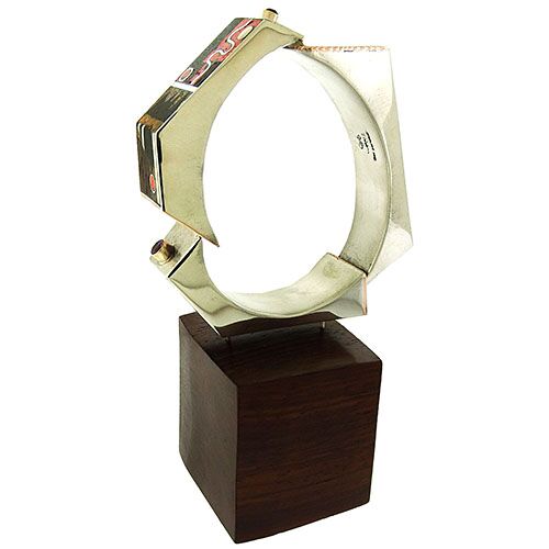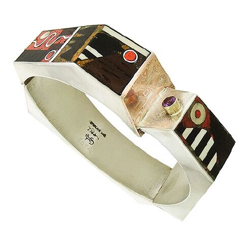 Tod Pardon’s 1992 mixed media inlay bangle bracelet is composed of inlay segments combining woods, bone, resin and pigment, in bold black red and white combinations, alternating with sterling and sterling silver and copper striped surfaces, with gems. The bracelet is designed to be display when not being worn, it measures 3-1/2″ x 2-7/8″ high x 3/4″ wide, and fits medium wrists.