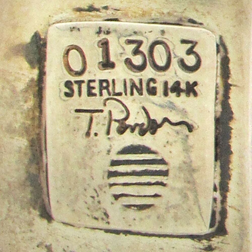 Tod Pardon’s mysterious creatures are designed to be worn as a brooch, or as a sculpture, this one, with wings or arms upraised in an inlay of sterling, ebony, gold, and pigmented glass with a soaring slim sterling body. The brooch measures 2-1/4″ x 6″, with stand.