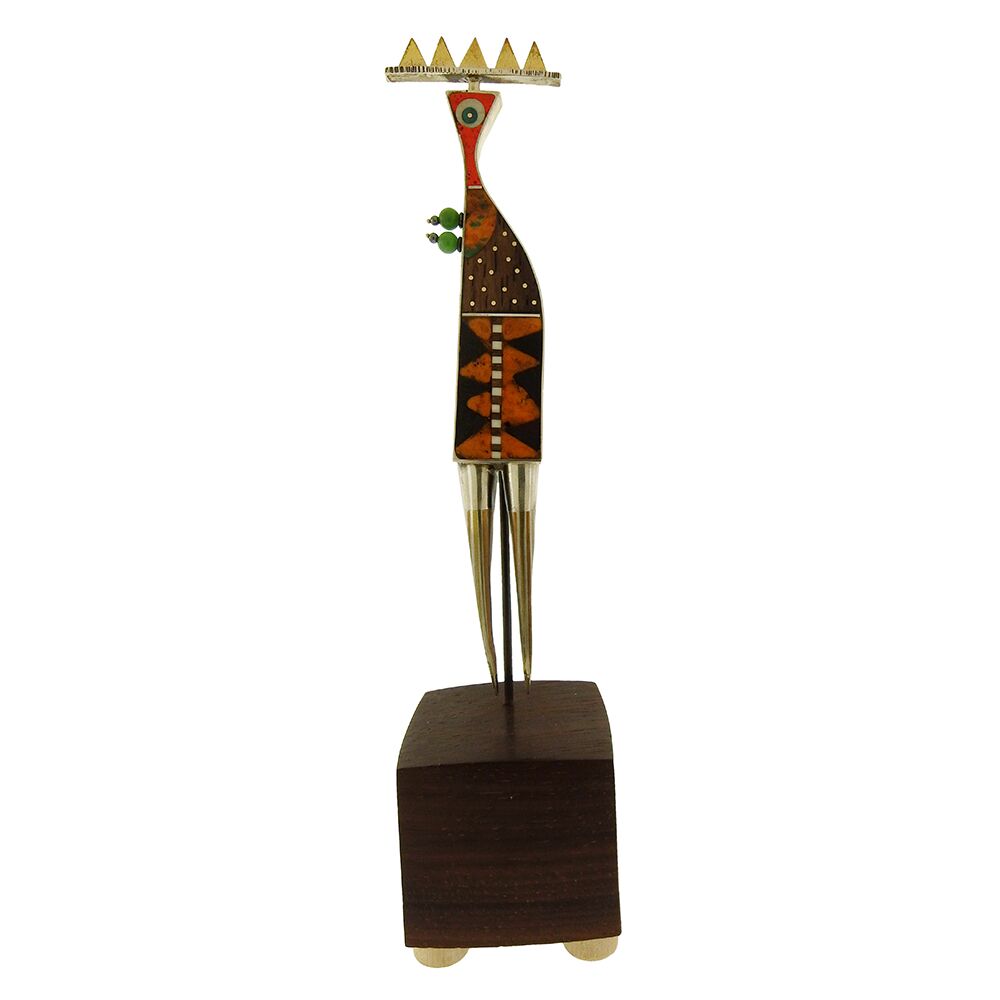 Early Tod Pardon sculpture/brooch titled ‘Mercy’, made in 1994, is an inlay of pigment, wood, bone, turquoise, with married metal brass and sterling ‘legs’ and 14K and 22K gold, and chrysoprase beads. Brooch measures 3/4″ x 6-1/8″ x 1/4″. The solid wood stand measures 2″ x 2″ x 2″.